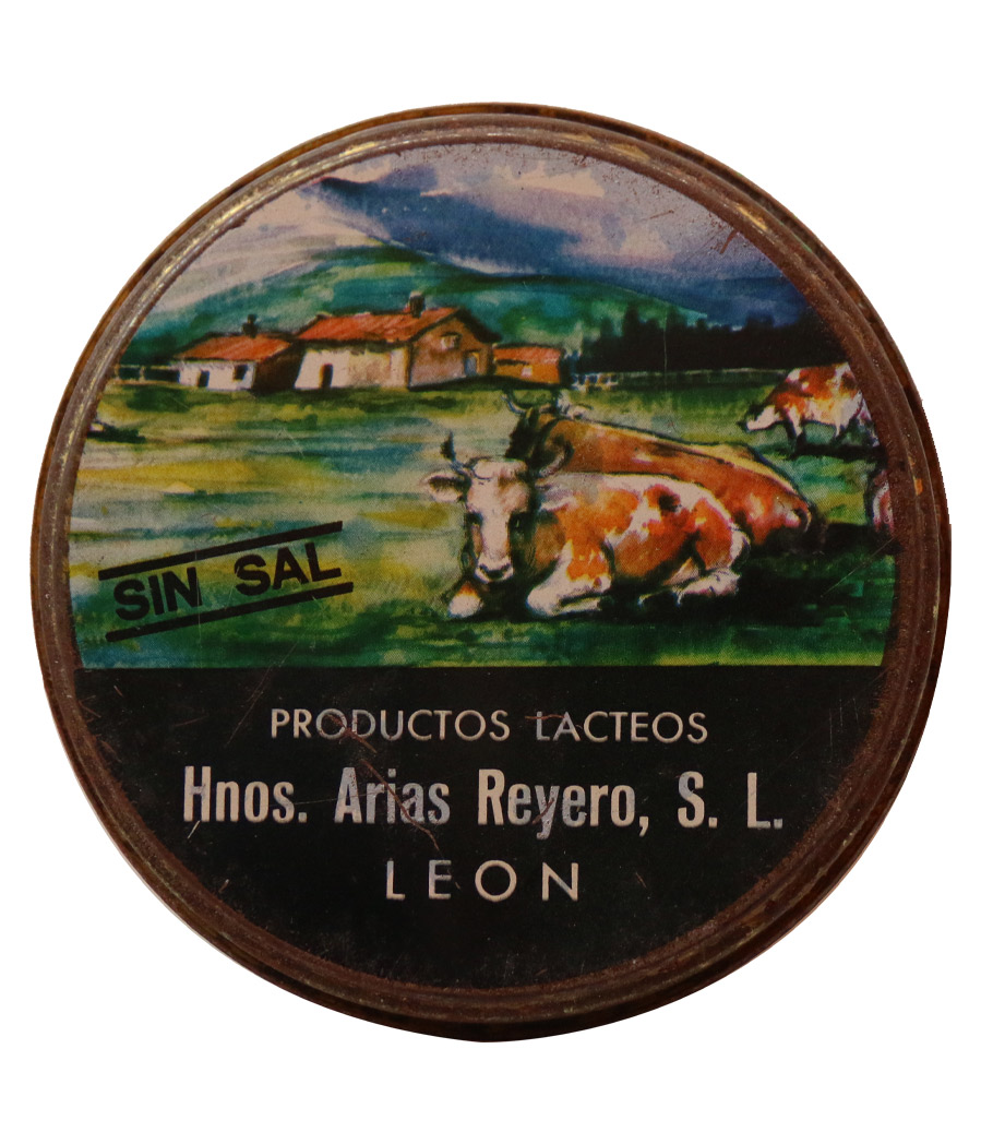 | C165 | Caja metalica | CAJA METALICA REDONDA. Productos Lácteos Hnos. Arias Reyero, S.L. Mantequilla pura de vaca con sal. Peso bruto 400 gr. Inquiosa Valladolid. R.G. SANIDAD 384. Dirección (Federico Echevarría, 2) y teléfonos (227700 - 227704) en negro y en el borde interior de la tapa. Peso ( Neto 300 gr.). Fondo externo blanco. | | León | | | |