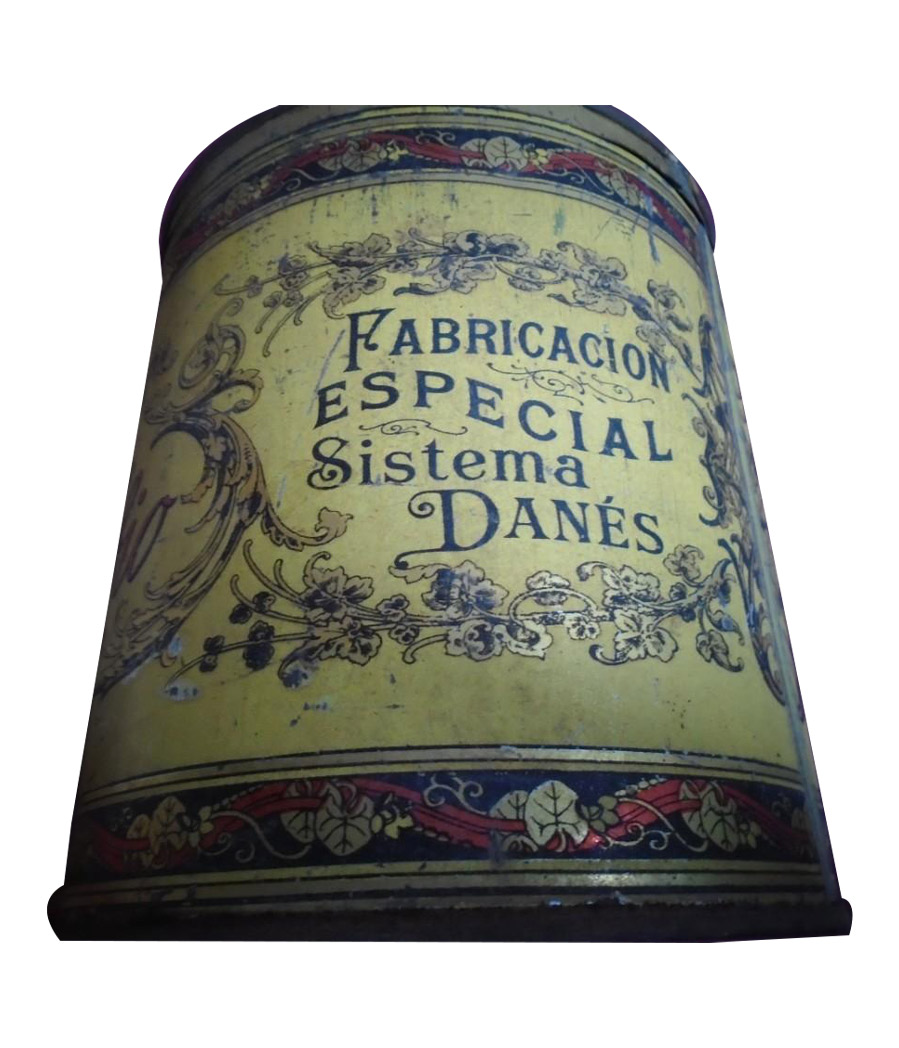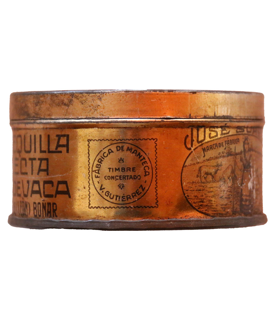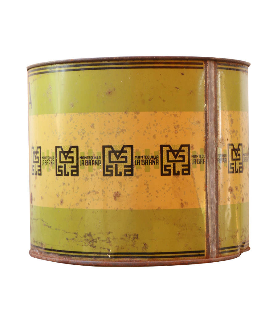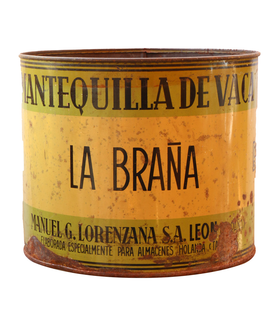 | C021 | Caja metalica | Bote metálico, MANTEQUILLA LA BRAÑA. MANUEL G. LORENZANA. ELABORADA ESPECIALMENTE PARA ALMACENES HOLANDA. BOTE HOJALATA CON TAPA FABRICADO POR ROCHELT, BILBAO. PARA 5 KG. Tapa artesanal elaborada con otro bote de la misma marca. | | | |