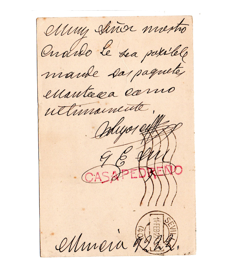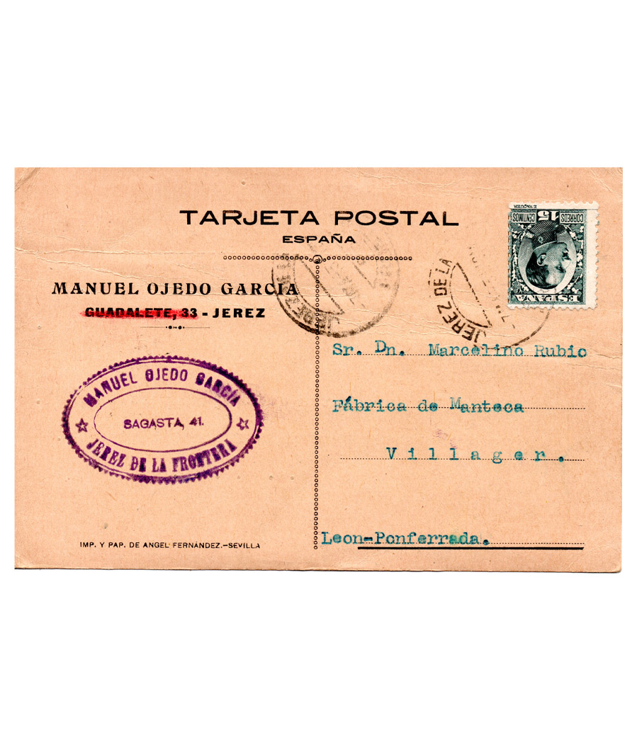 | C027 | Entero postal | ENTERO POSTAL ENVIADO A MARCELINO RUBIO A VILLAGER. Remitido por Casa Pedreño, de Sevilla, el 11 de febrero de 1922. | 1922_02_11 | Villager, León | |