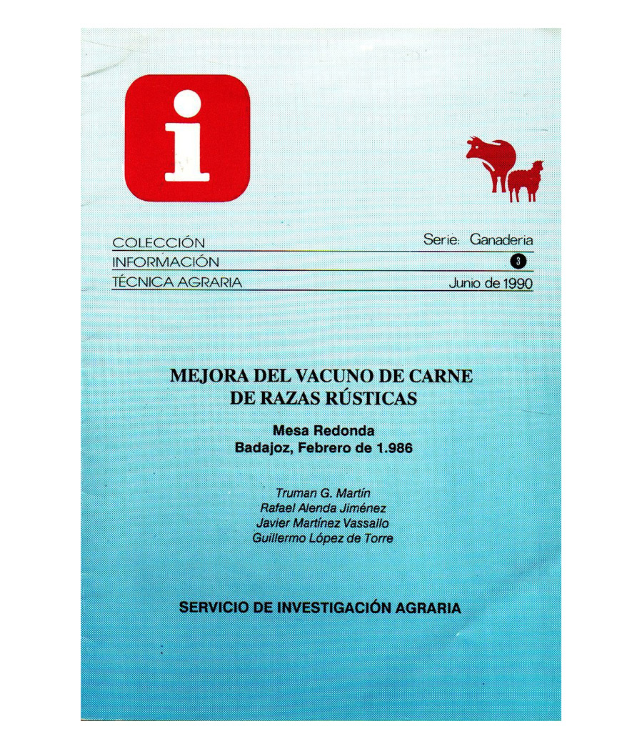 | C099 | Publicación | MEJORA DEL VACUNO DE CARNE DE RAZAS RUSTICAS_Mesa redodnda_Colección Información Técnica Agraria_Servicio de Investigación Agraria_Junta de Extremadura_Consegería de Agricultura, Industria y Comericio. | 1990 | Badajoz | |