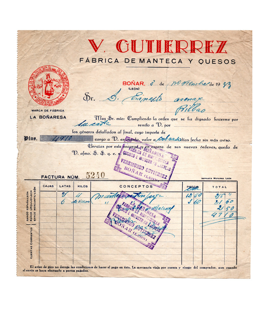 | C108 | Documento Comercial | Factura V. GUTIERREZ. La Boñaresa. Fabrica de Manteca y quesos. | 1953_XI-03 | Boñar (León) | |