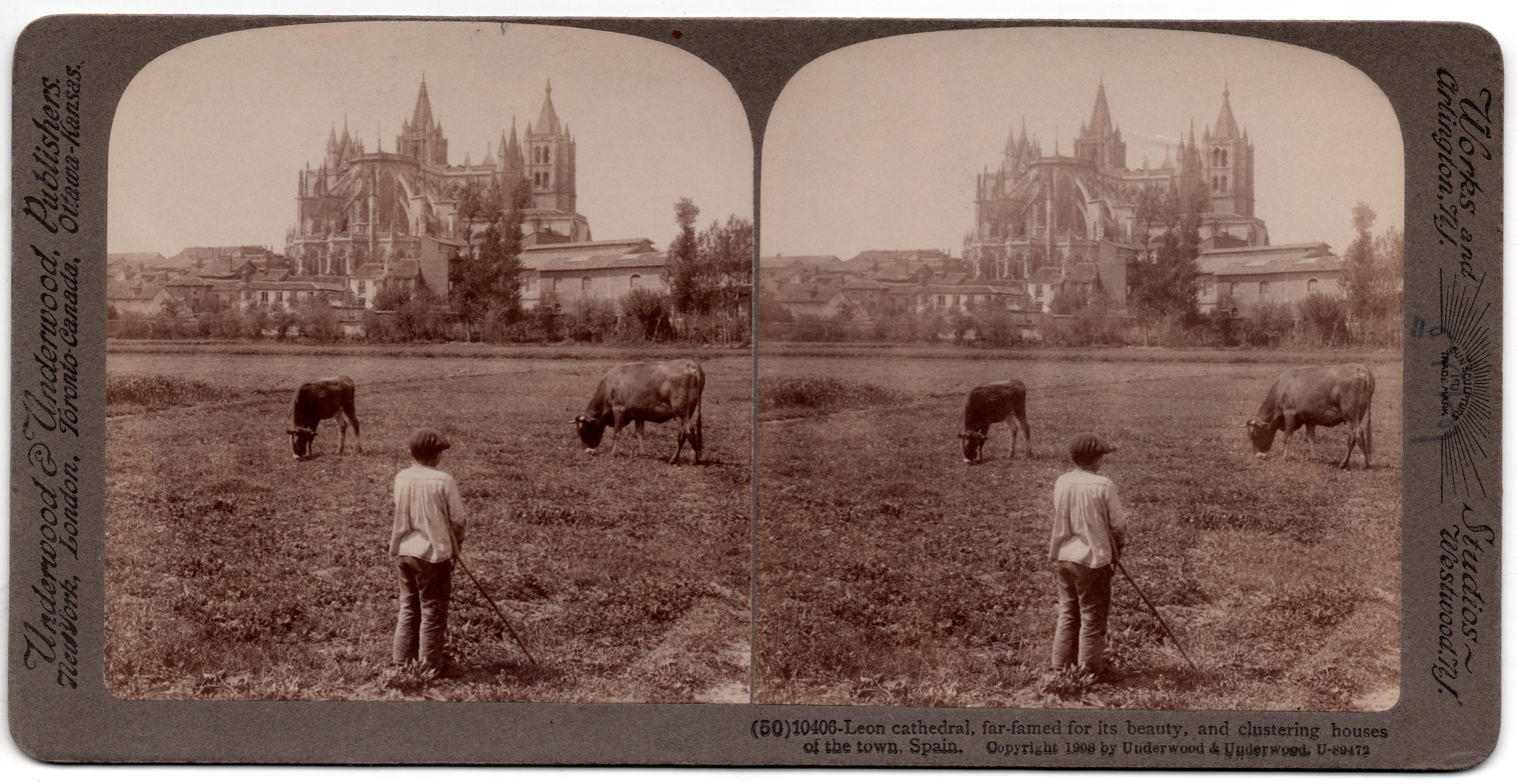 | C110 | Fotografía Estereoscopica | LEON CATHEDRAL, FAR-FAMED FOR ITS BEAUTY, AND CLUSTERING HOUSES OF THE TOWN, SPAIN. (50) 10406. Copyright 1908 by Underwood & Underwood. U-89472 (comprada en Canadá) | 1908 | León | |