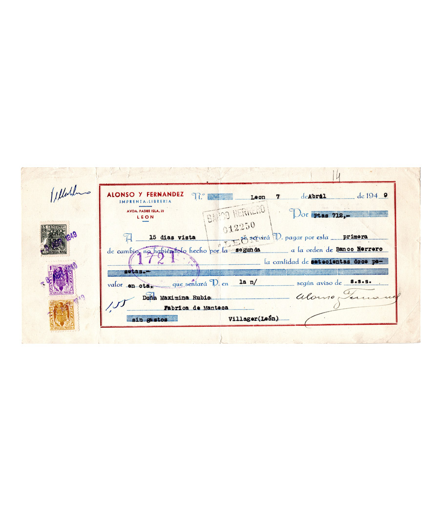 | C117 | Documento Comercial | Letra de Cambio Emitida por ALONSO Y FERNANDEZ. Imprenta - Librería. Pade Isla, 22. A Dña. MAXIMINA RUBIO, VILLAGER. | 1949 | León | |