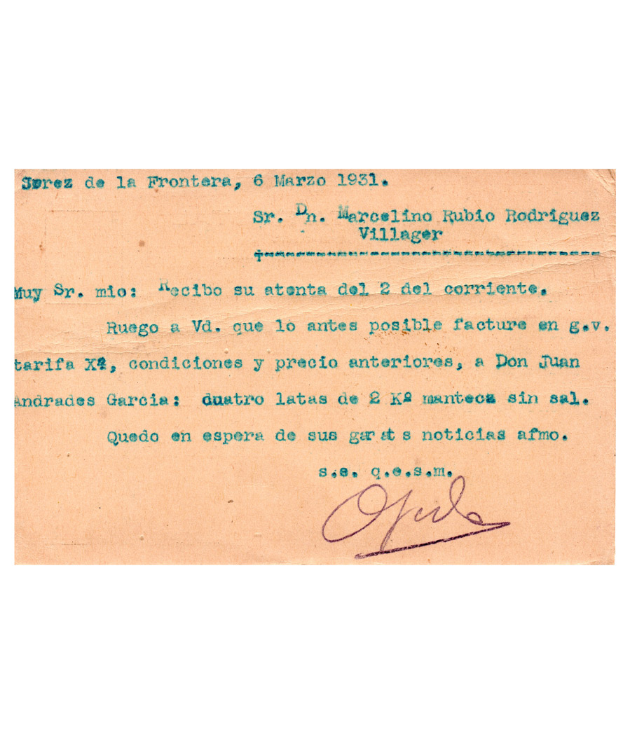 | C120 | Tarjeta Postal | Tarjeta postal sin ilustración. Emitida y enviada por MANUEL OJEDO GARCIA, Jerez, a MARCELINO RUBIO, Villager. Pedido de Manteca. | 1931 | Jerez | |