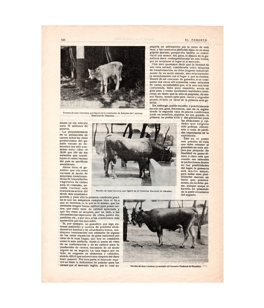 | C140 | Publicación | Hoja de revista EL FOMENTO. Artículo "La fabricación de las carnes". Con dos fotografias de novillo y novilla de raza leonesa presentados en el concurso nacional. | 1926_06_15 | Madrid. | |