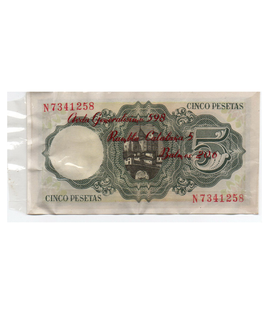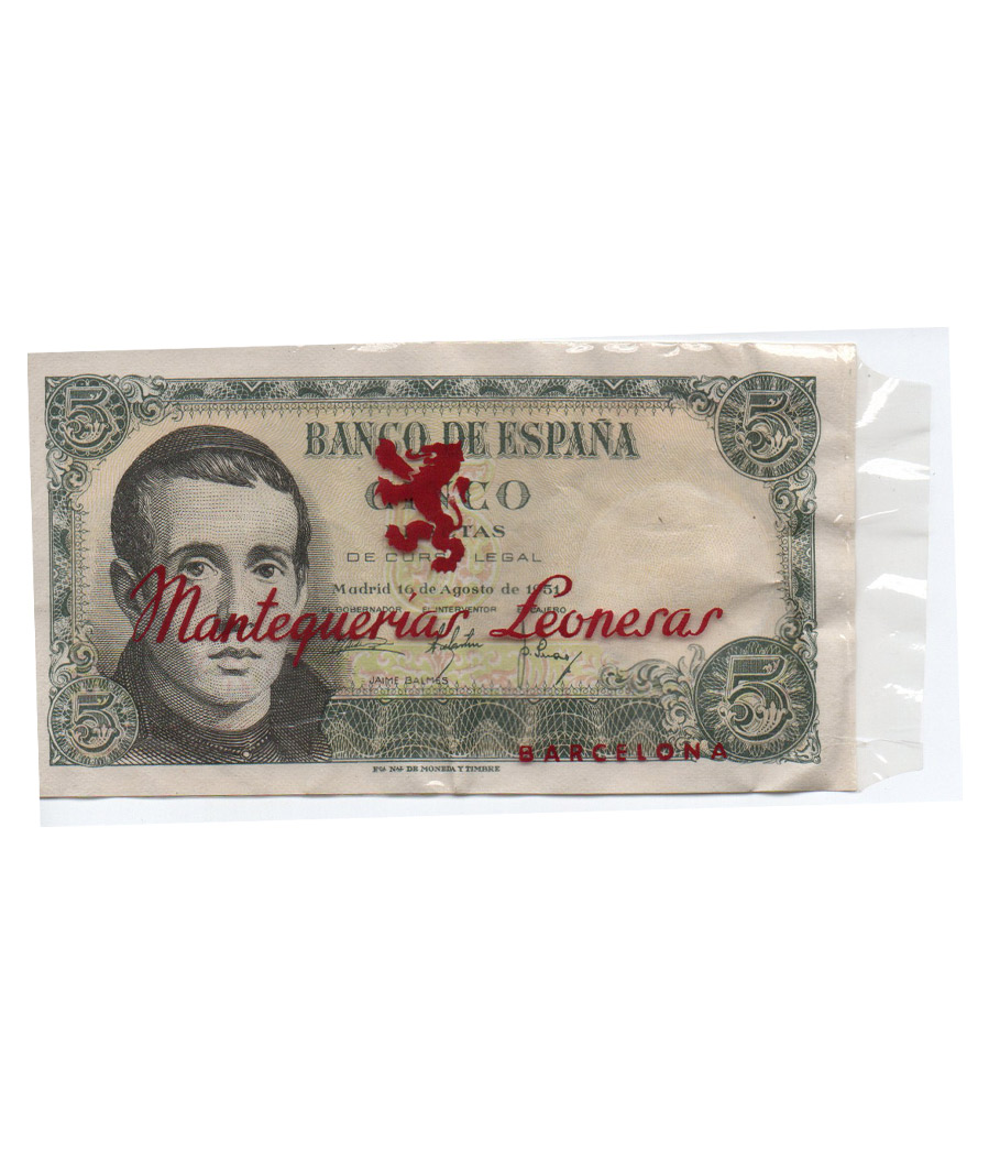 | C152 | Objeto Promocional | Sobre celofan billete MANTEQUERIAS LEONESAS. Avda. Generalisimo, 598 / Rambla Cataluña, 5 / Balmes 206. Barcelona. Pequeño transparente con billete de cinco pesetas de 1951, | | Barcelona | |
