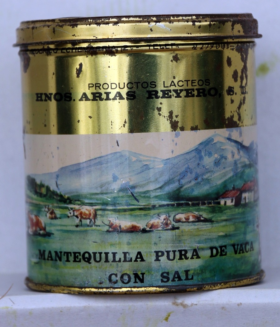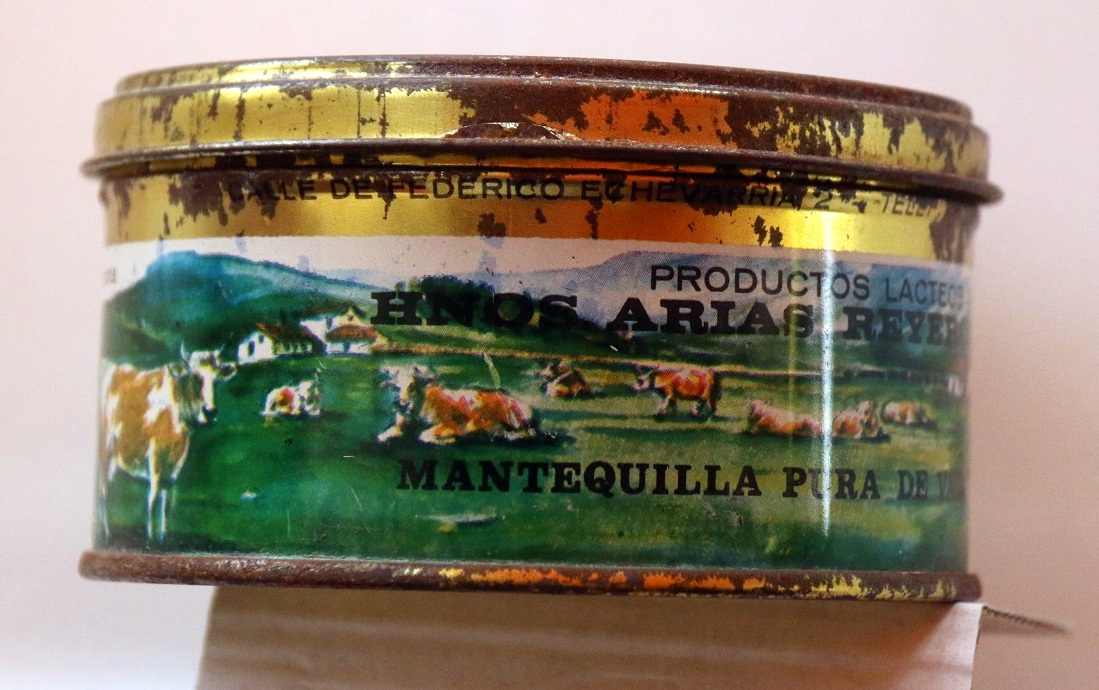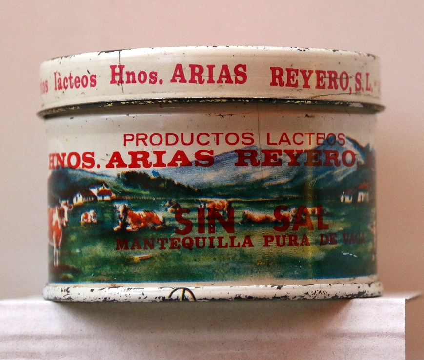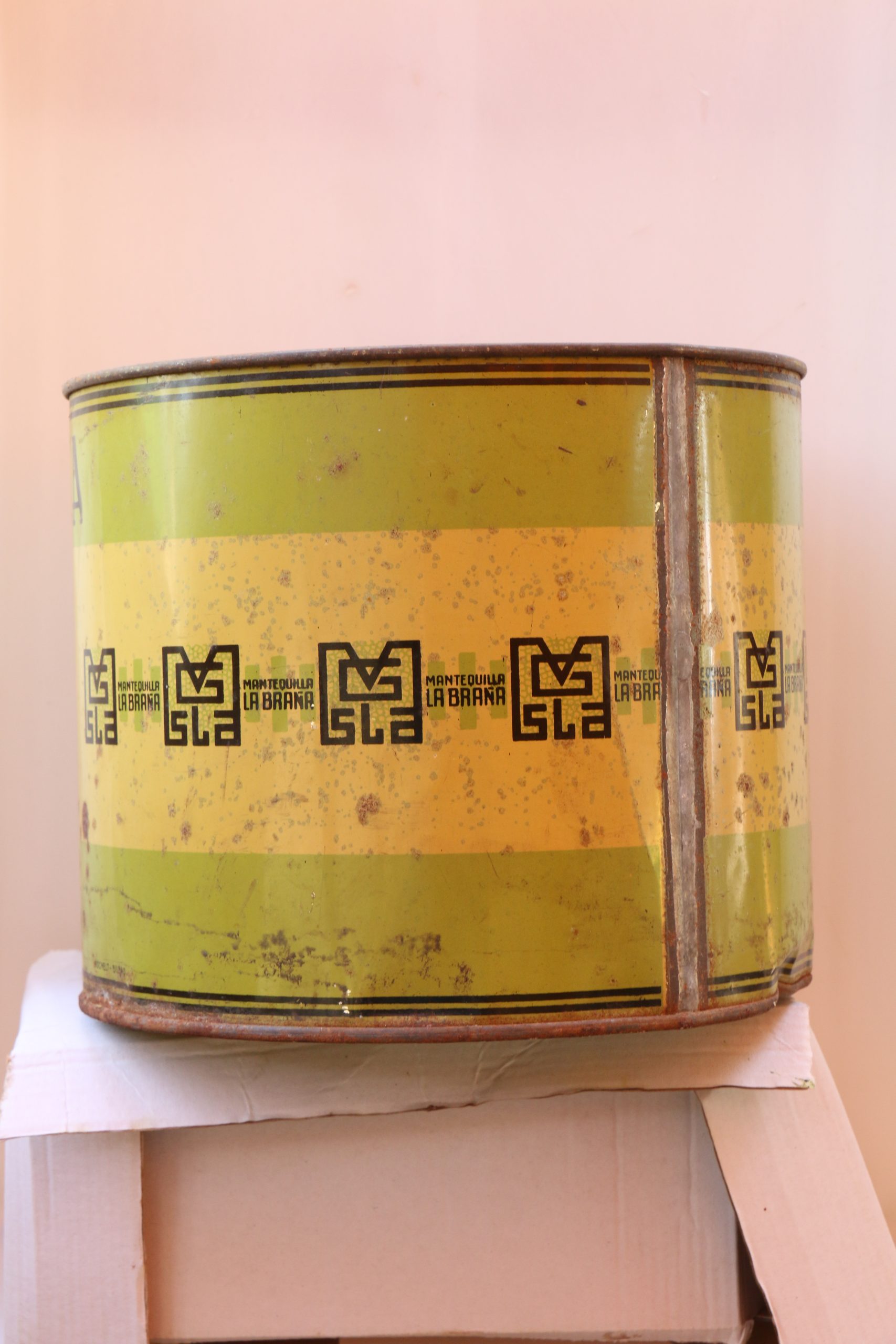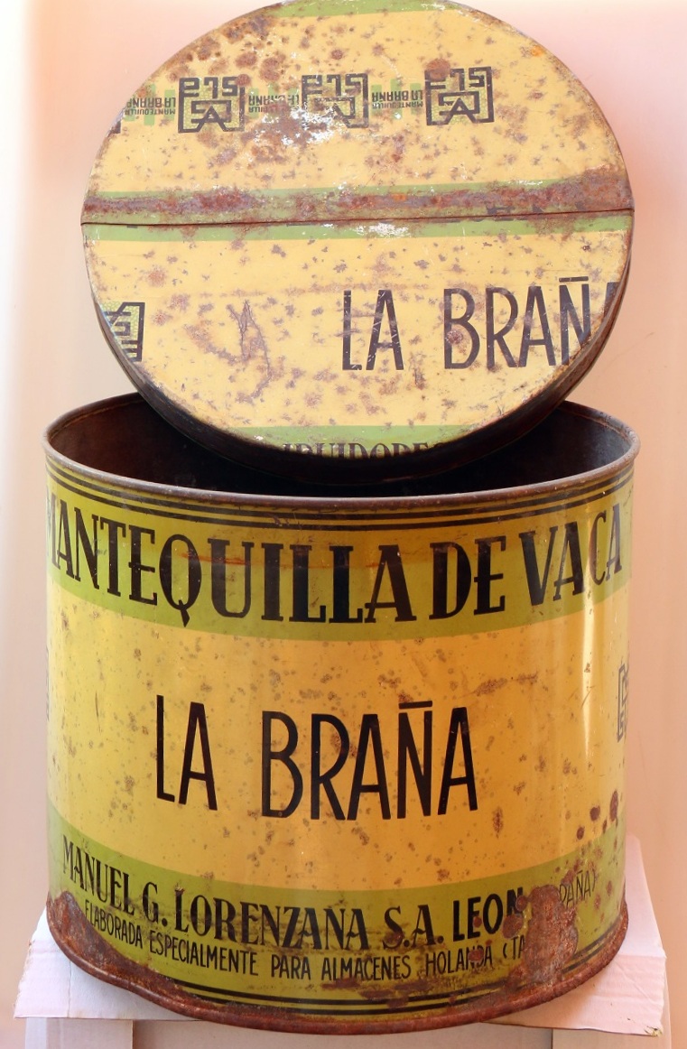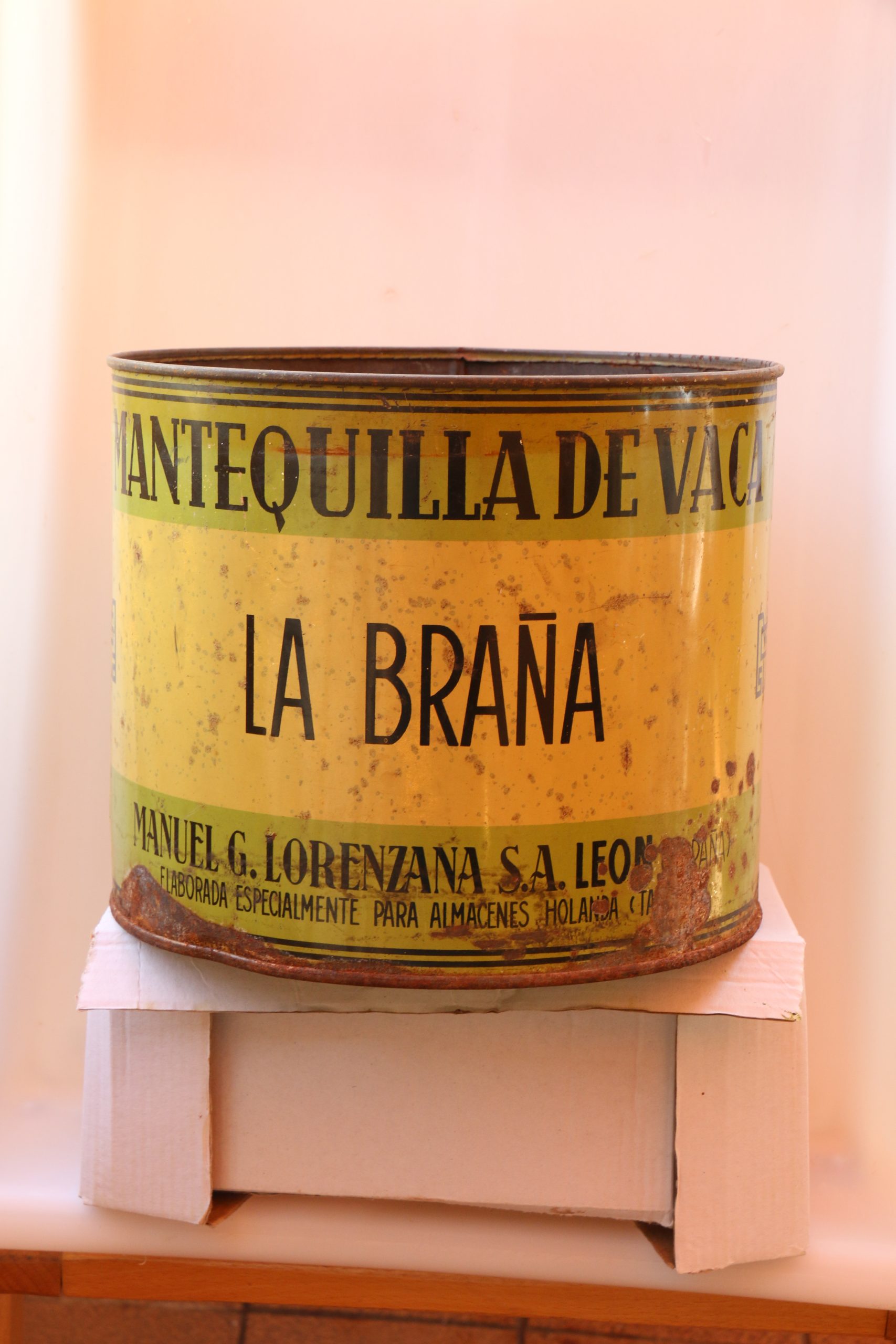 C021Bote metálico, MANTEQUILLA LA BRAÑA. MANUEL G. LORENZANA. ELABORADA ESPECIALMENTE PARA ALMACENES HOLANDA. BOTE HOJALATA CON TAPA FABRICADO POR ROCHELT, BILBAO. PARA 5 KG. Tapa artesanal elaborada con otro bote de la misma marca.s/dS/D