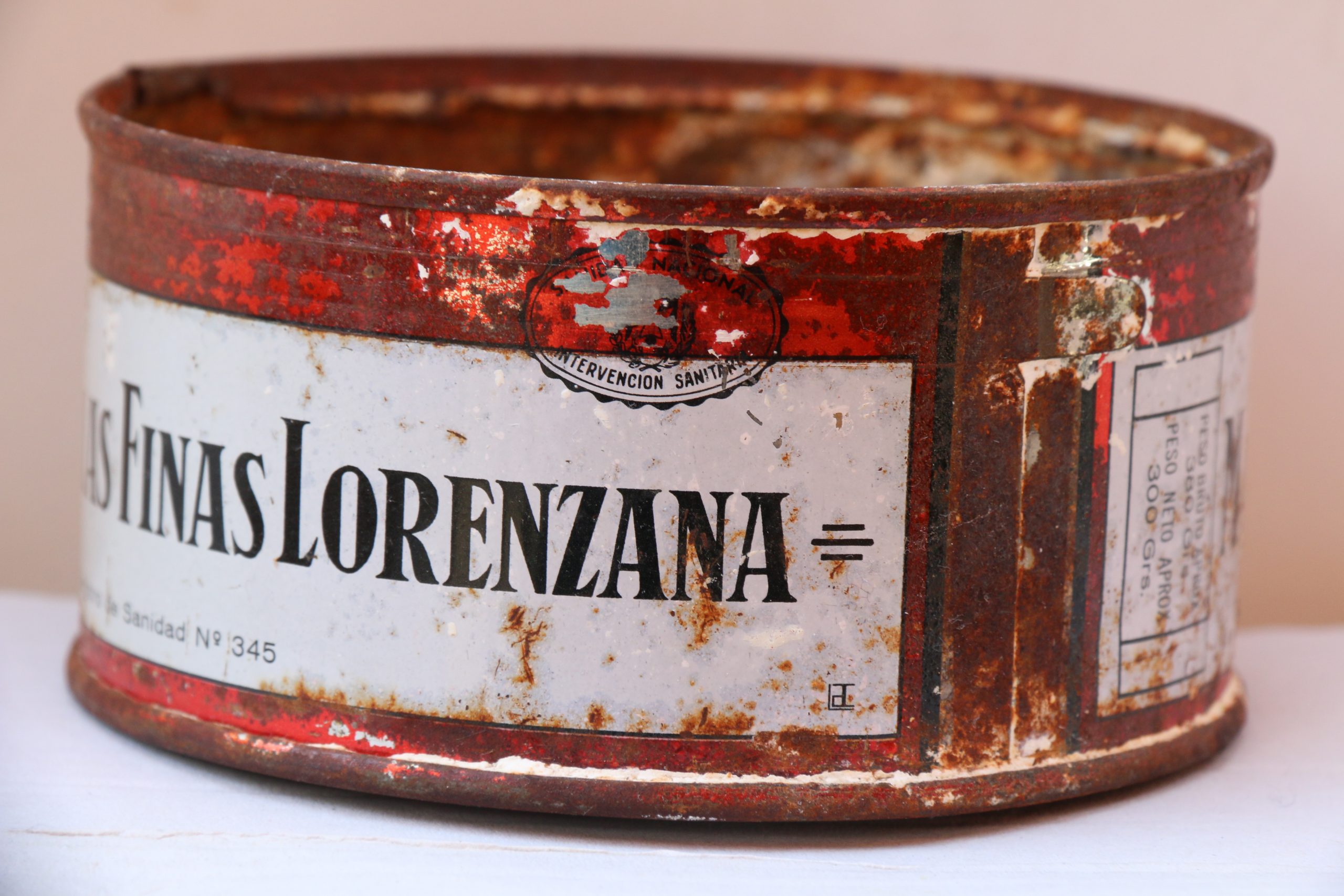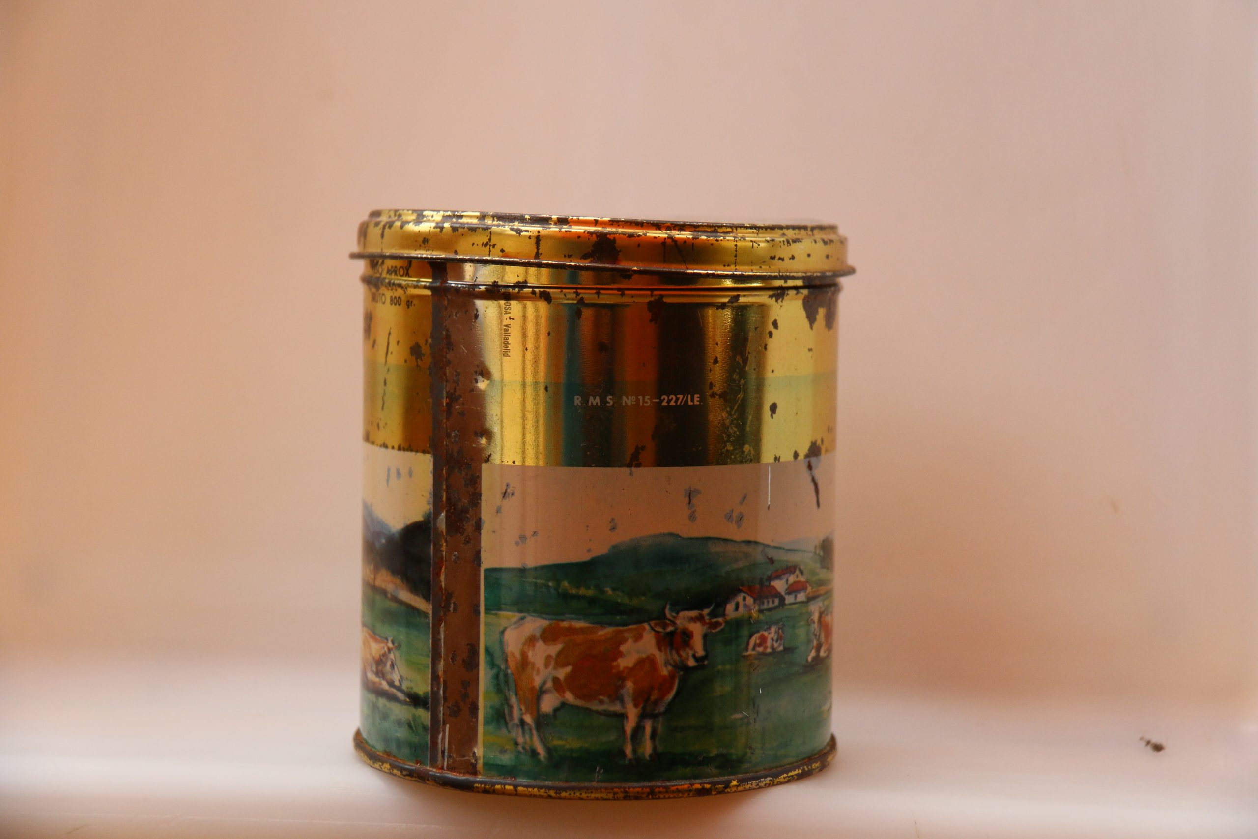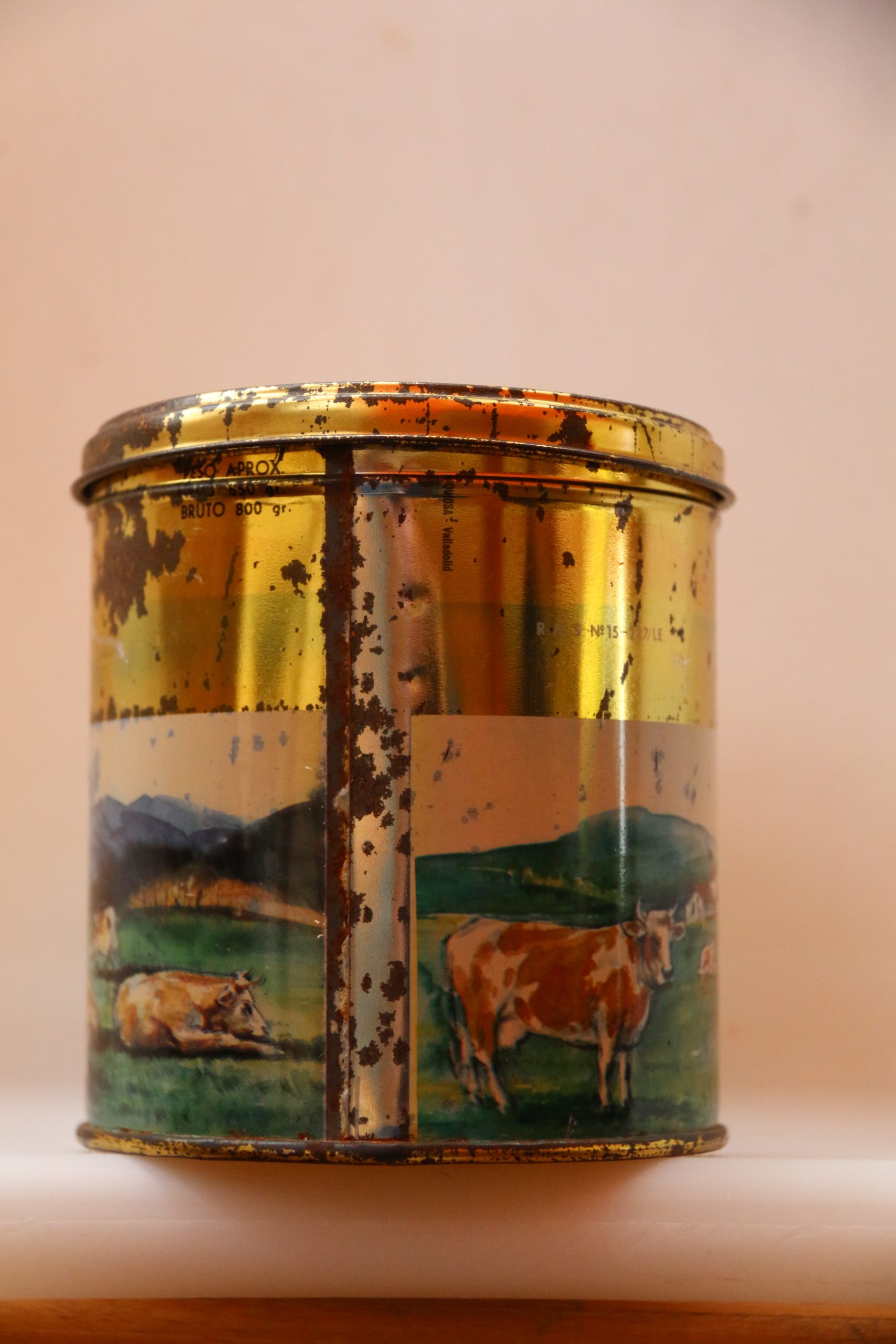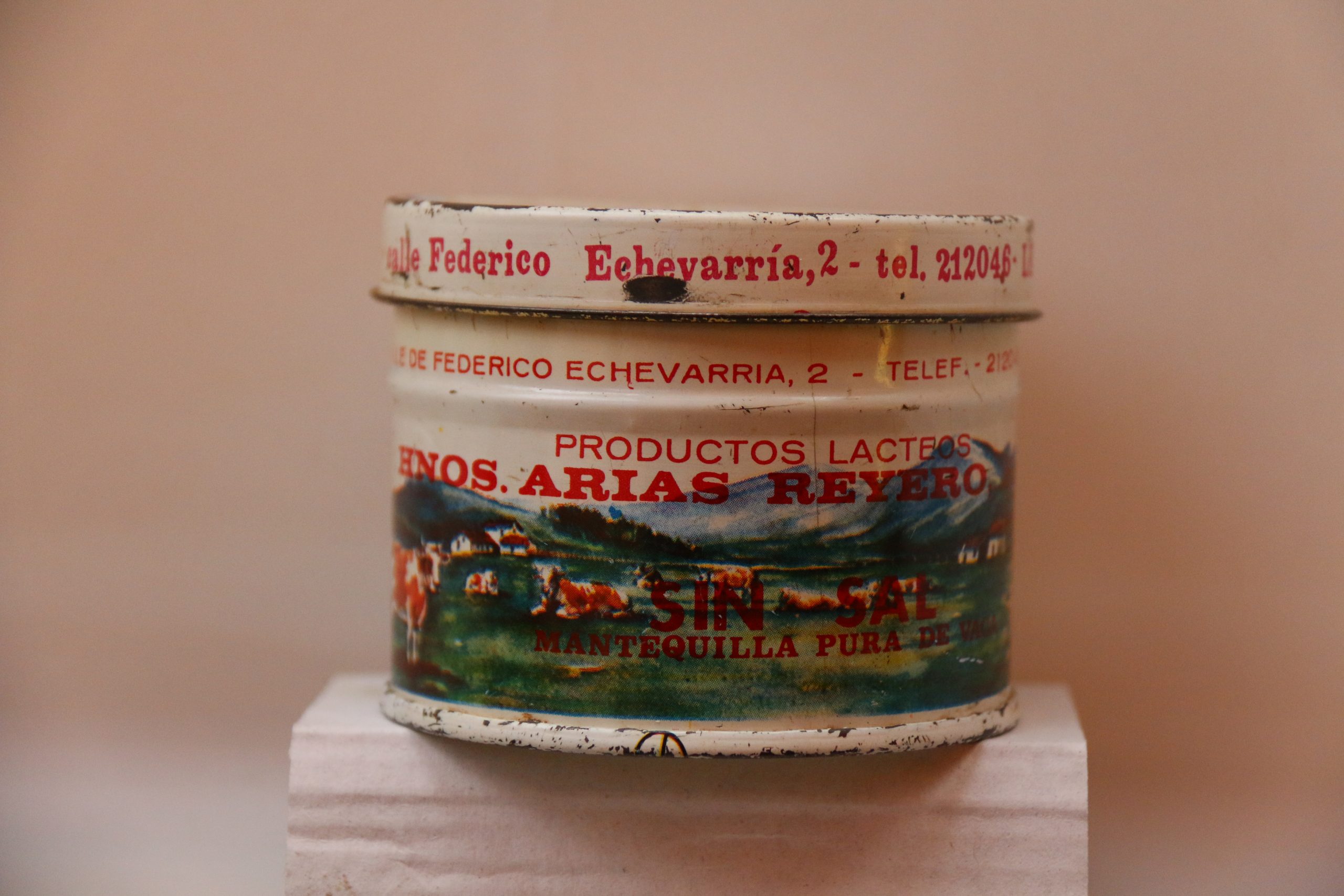 C021Bote metálico, MANTEQUILLA LA BRAÑA. MANUEL G. LORENZANA. ELABORADA ESPECIALMENTE PARA ALMACENES HOLANDA. BOTE HOJALATA CON TAPA FABRICADO POR ROCHELT, BILBAO. PARA 5 KG. Tapa artesanal elaborada con otro bote de la misma marca.s/dS/D