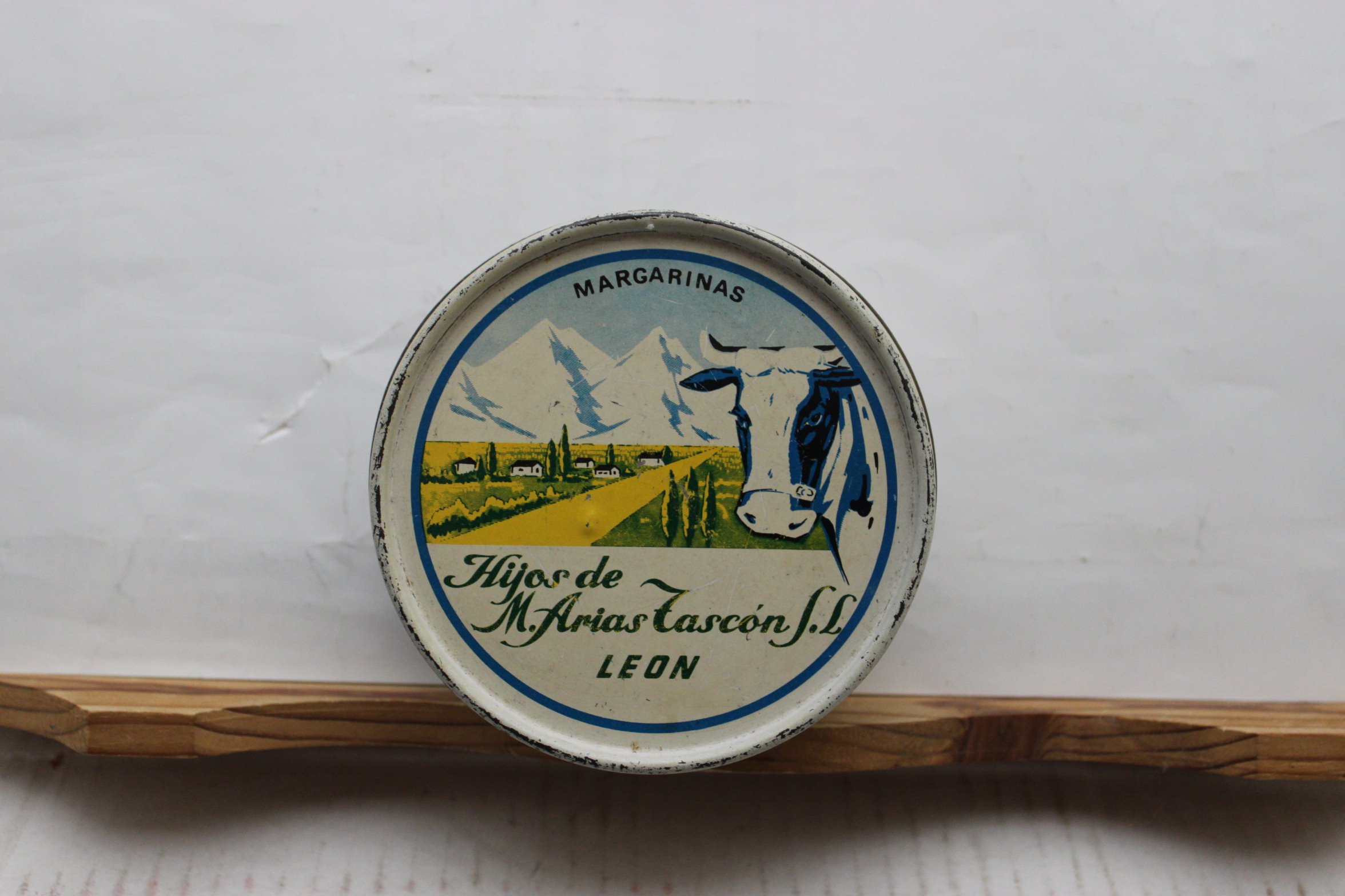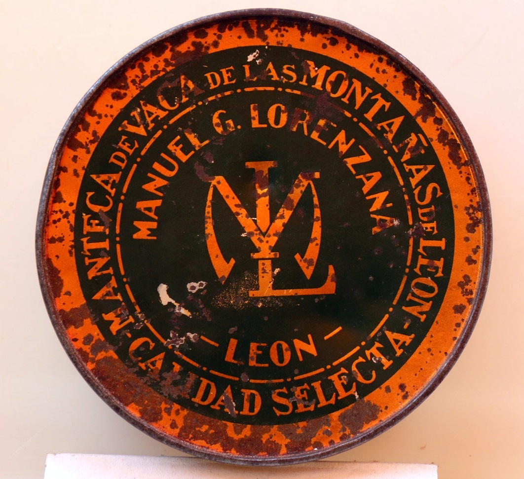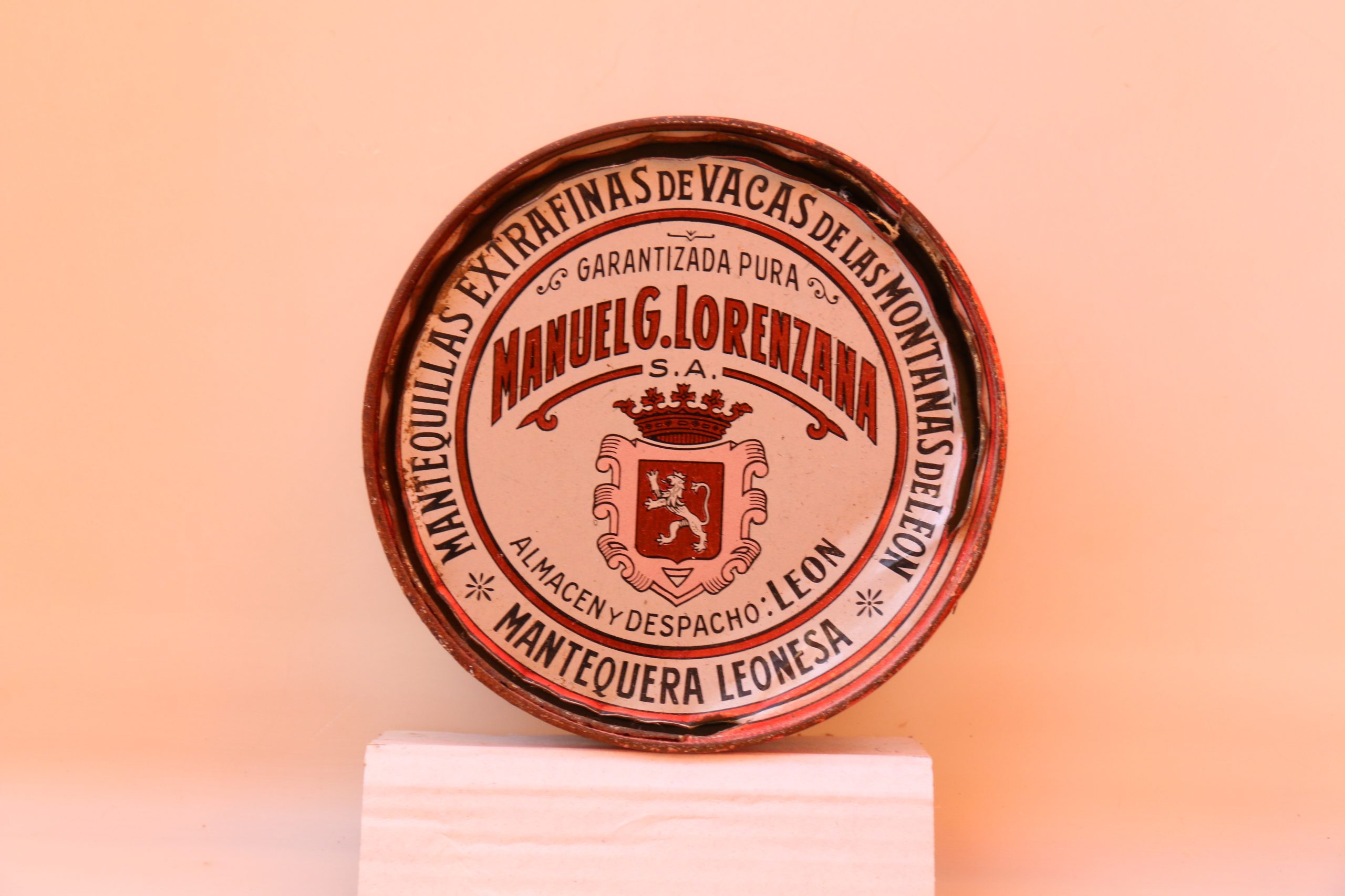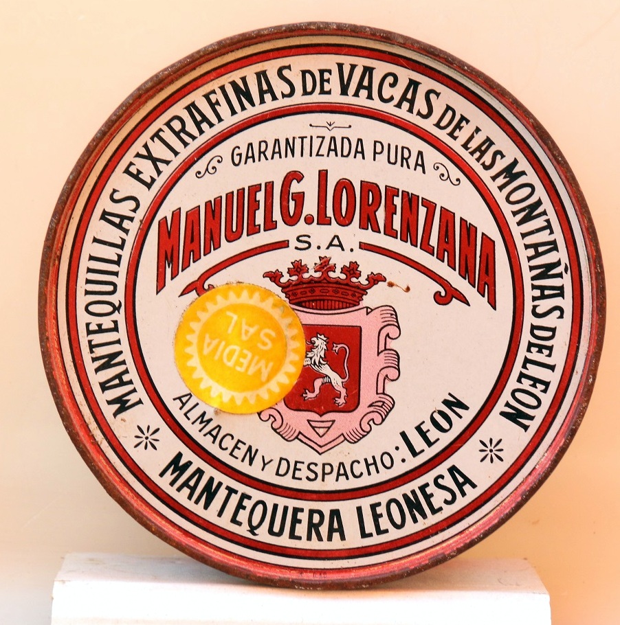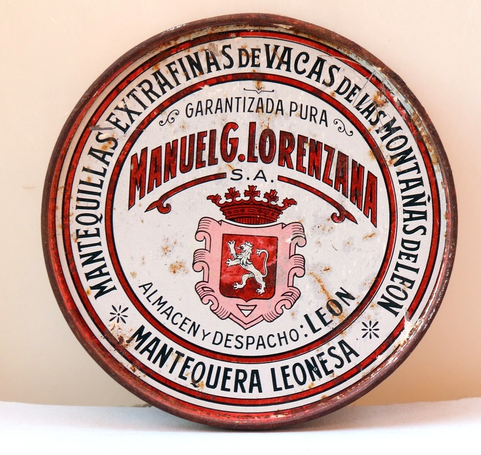 C077FABRICAS DE MANTECAS EXTRAFINAS DE VACAS DE LAS MONTAÑAS DE LEON. Garantizada Pura. Manuel G Lorenzana. Mantequera Leonesa. Con tapa de encajar. Escudo antiguo.s/dLeón