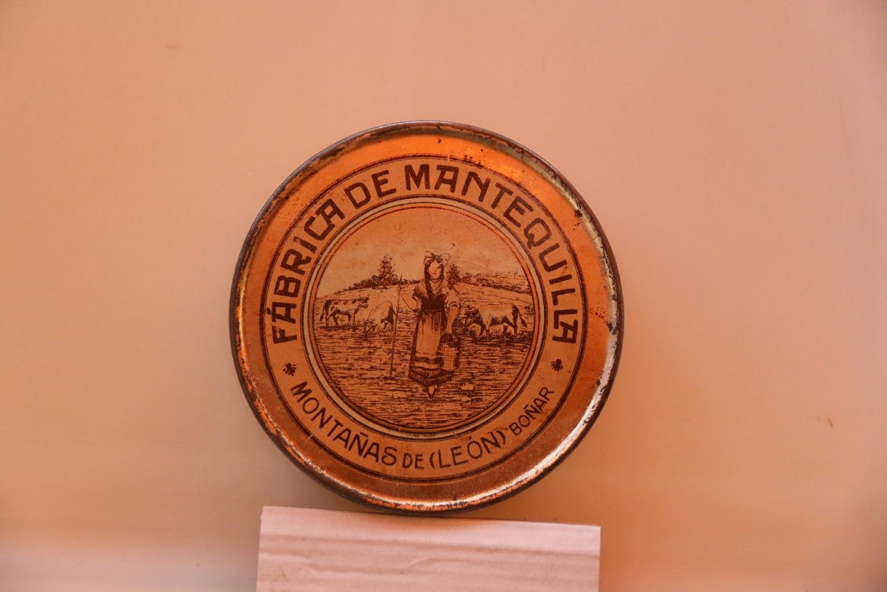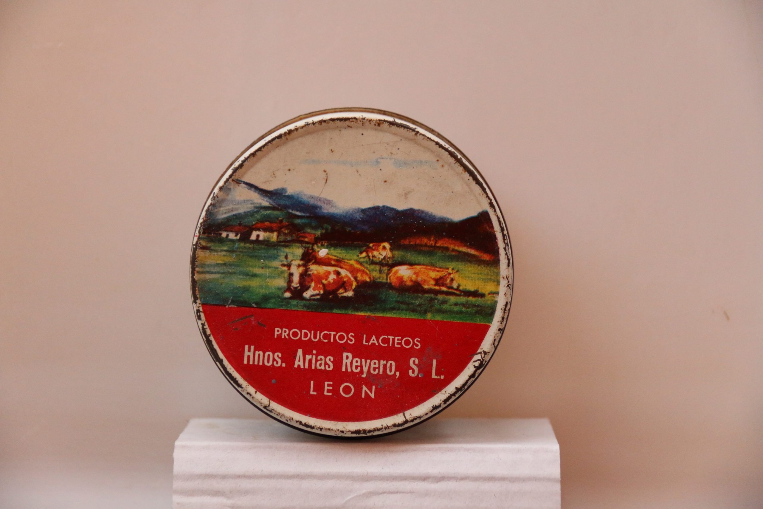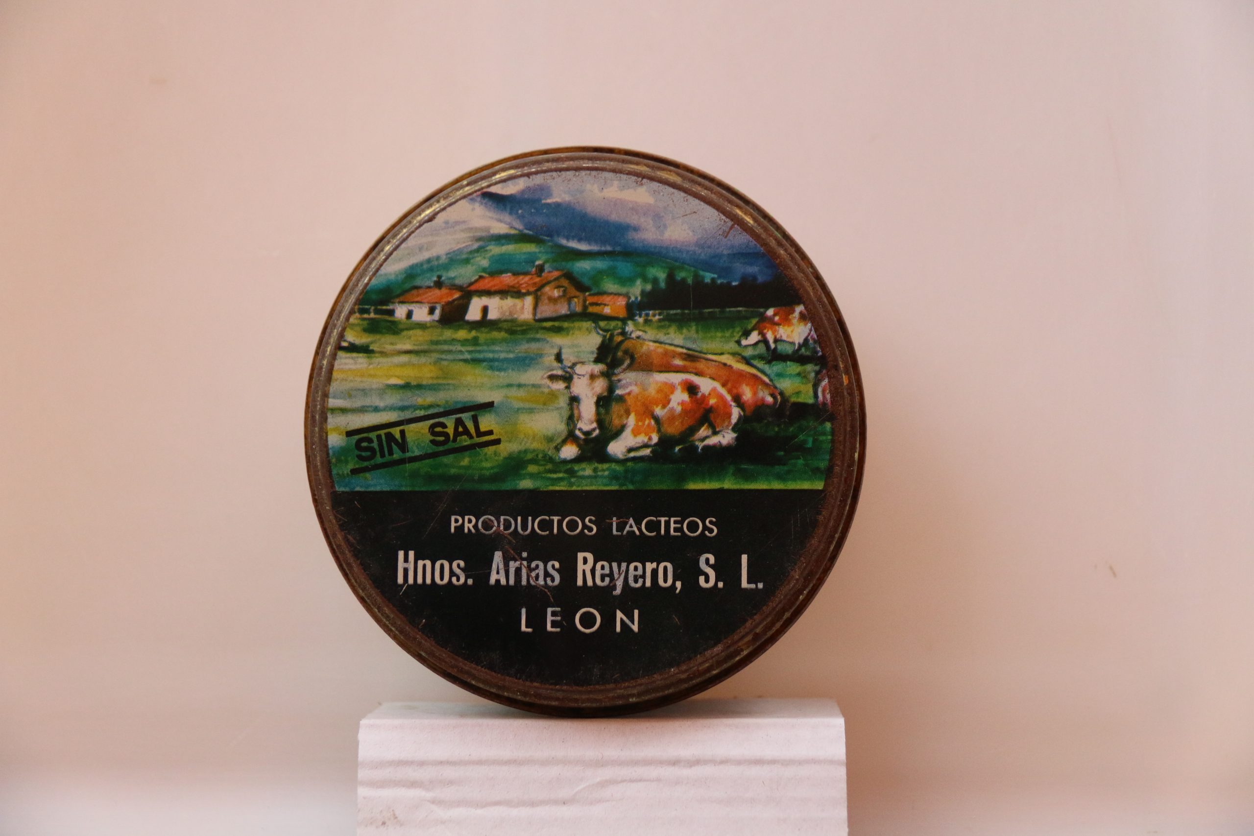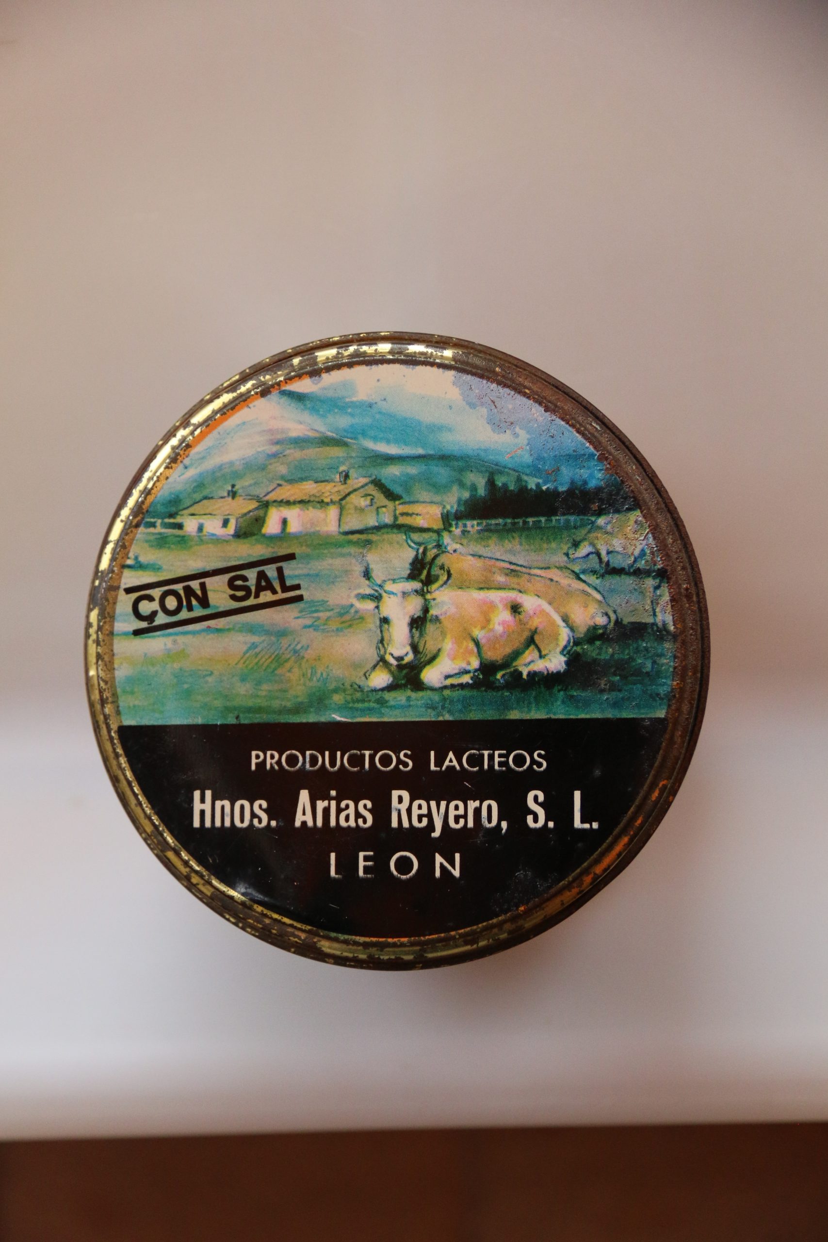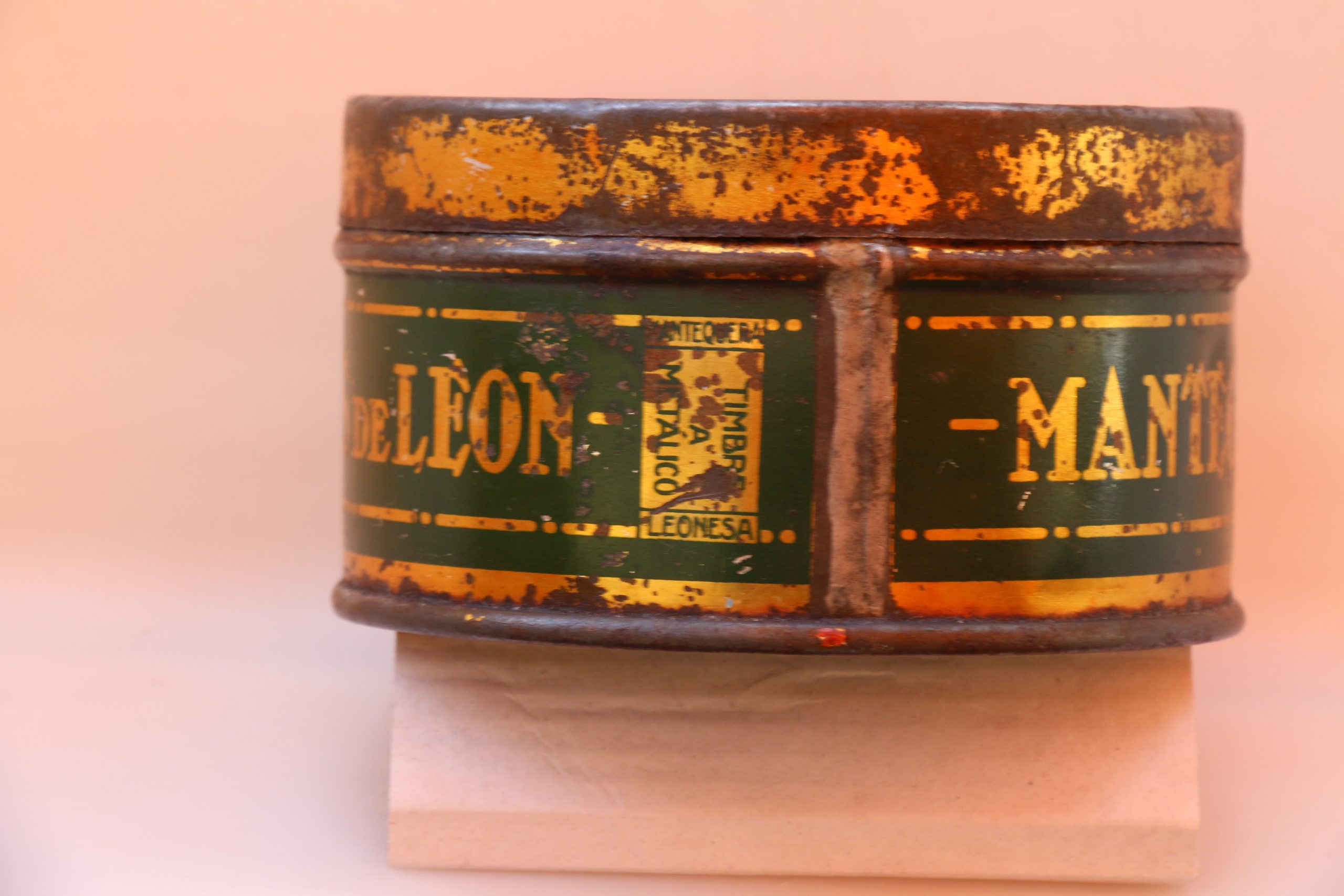 C077FABRICAS DE MANTECAS EXTRAFINAS DE VACAS DE LAS MONTAÑAS DE LEON. Garantizada Pura. Manuel G Lorenzana. Mantequera Leonesa. Con tapa de encajar. Escudo antiguo.s/dLeón