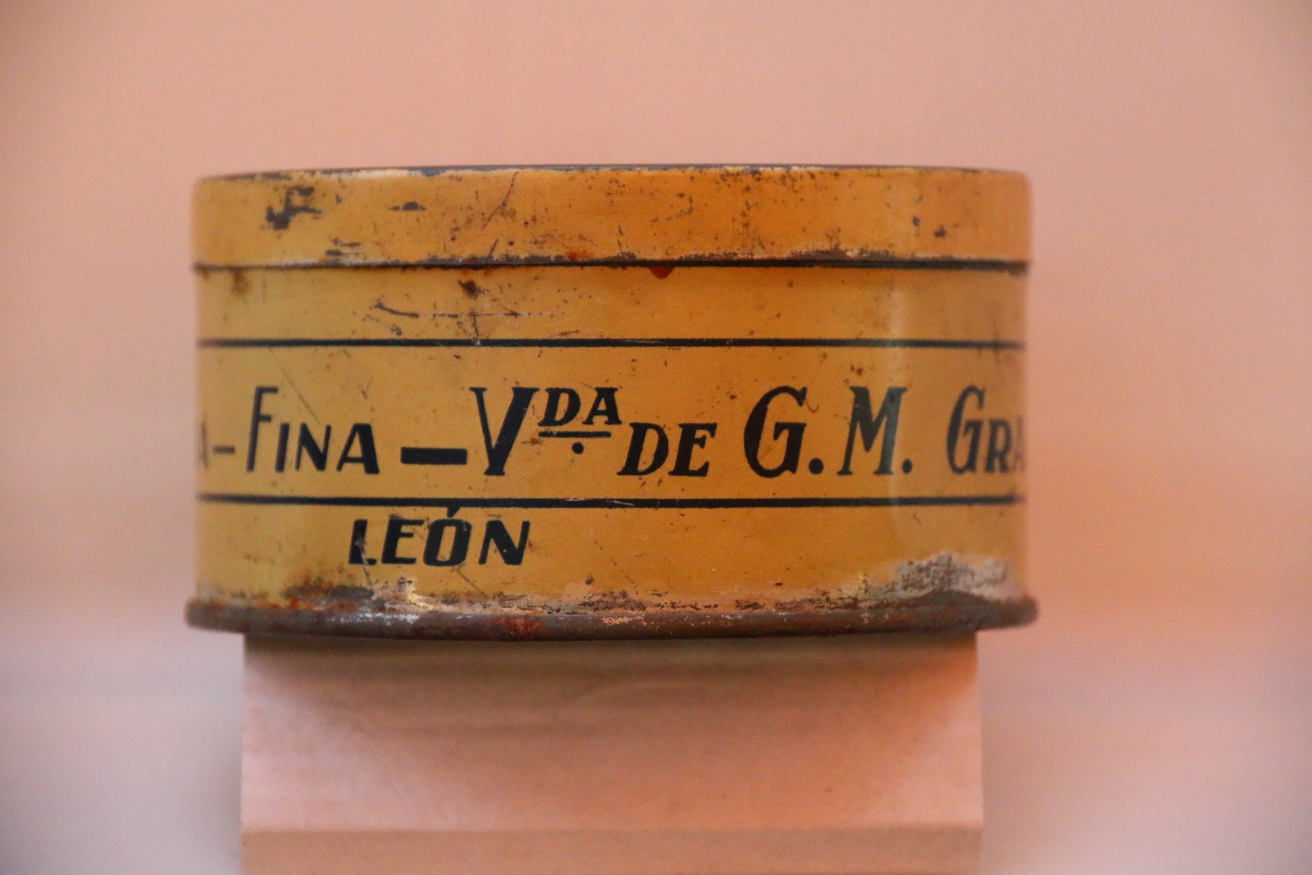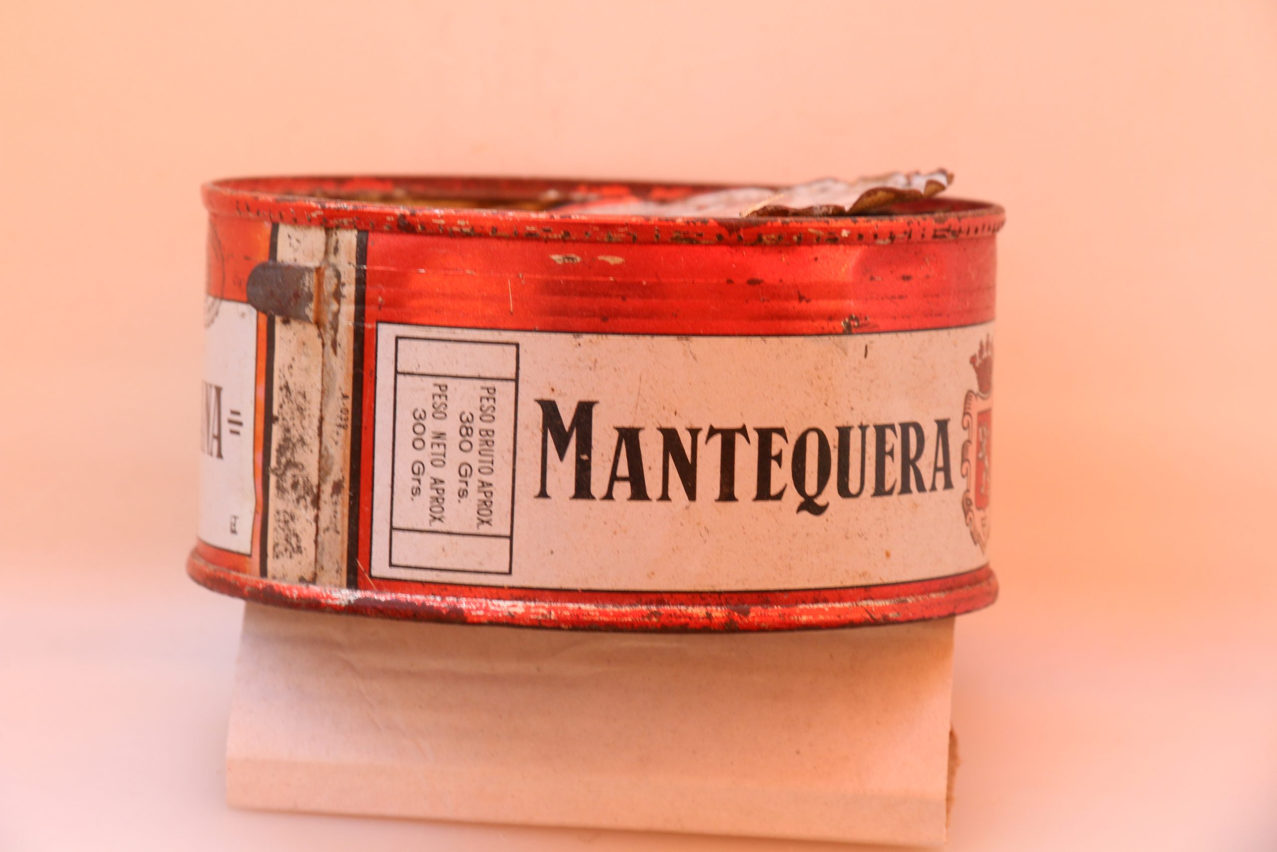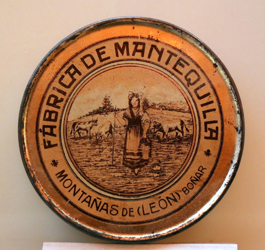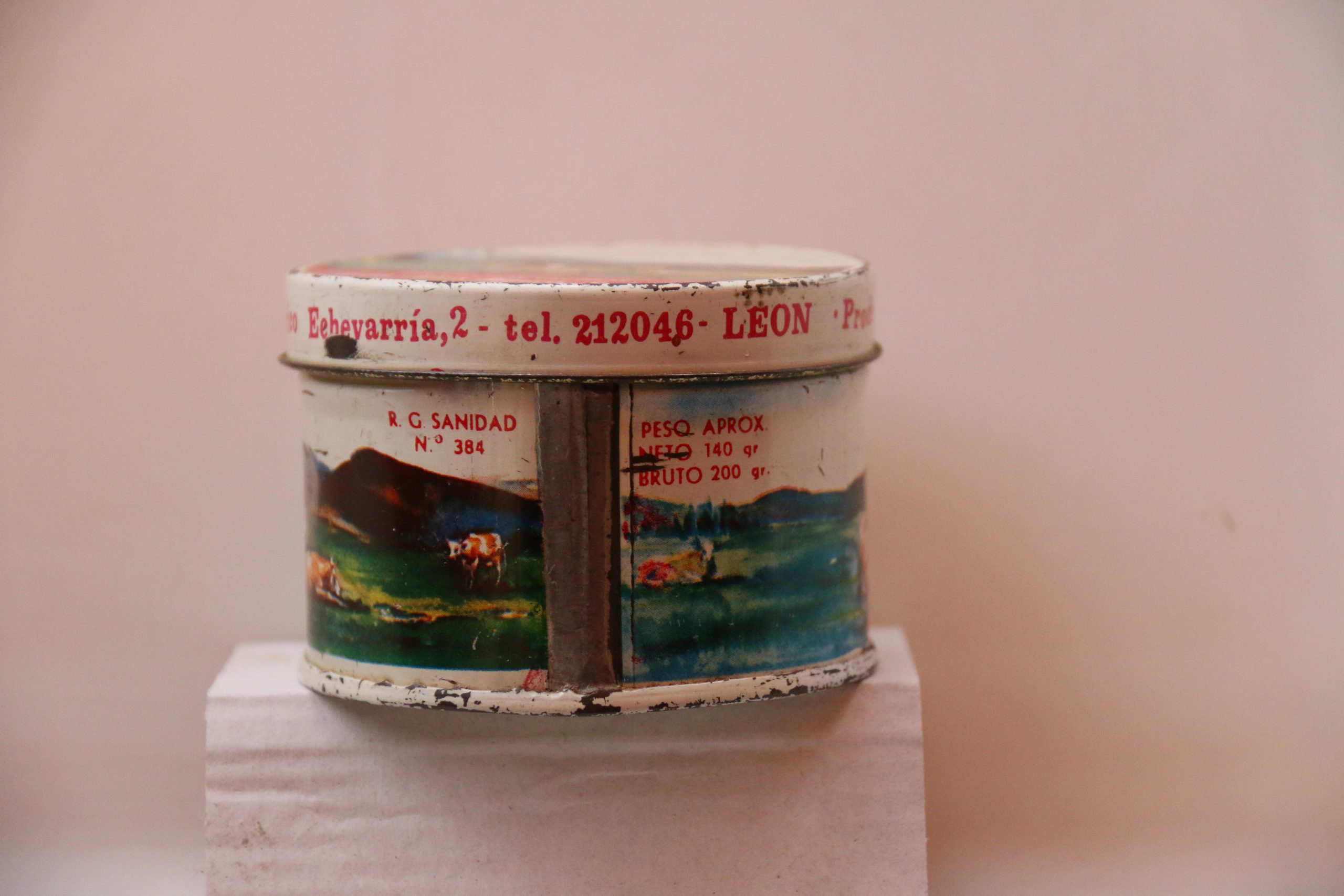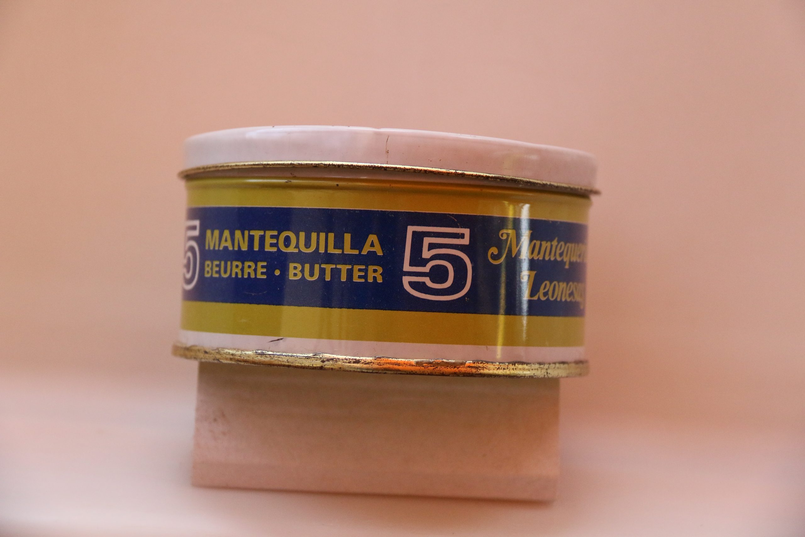 C077FABRICAS DE MANTECAS EXTRAFINAS DE VACAS DE LAS MONTAÑAS DE LEON. Garantizada Pura. Manuel G Lorenzana. Mantequera Leonesa. Con tapa de encajar. Escudo antiguo.s/dLeón