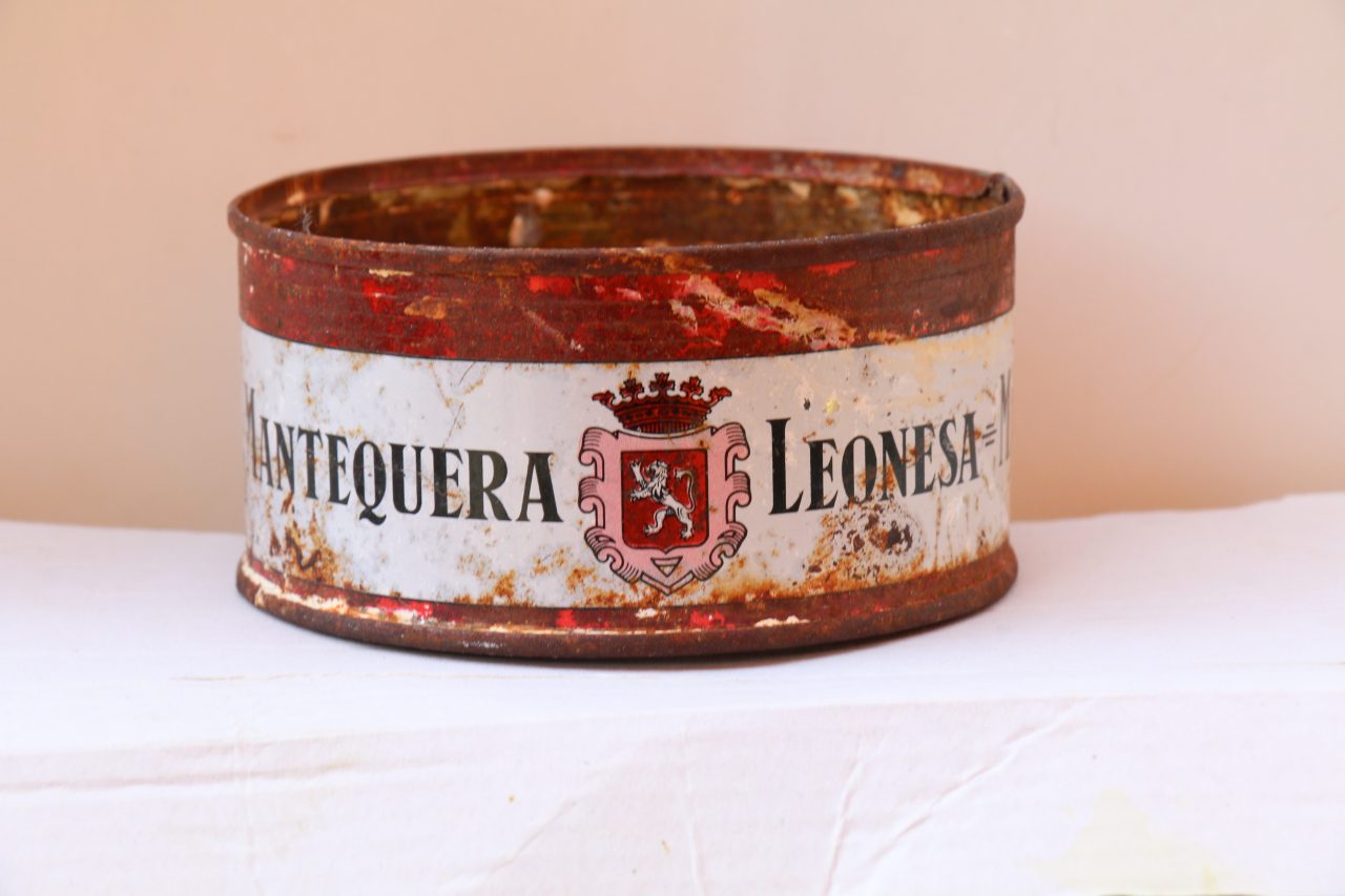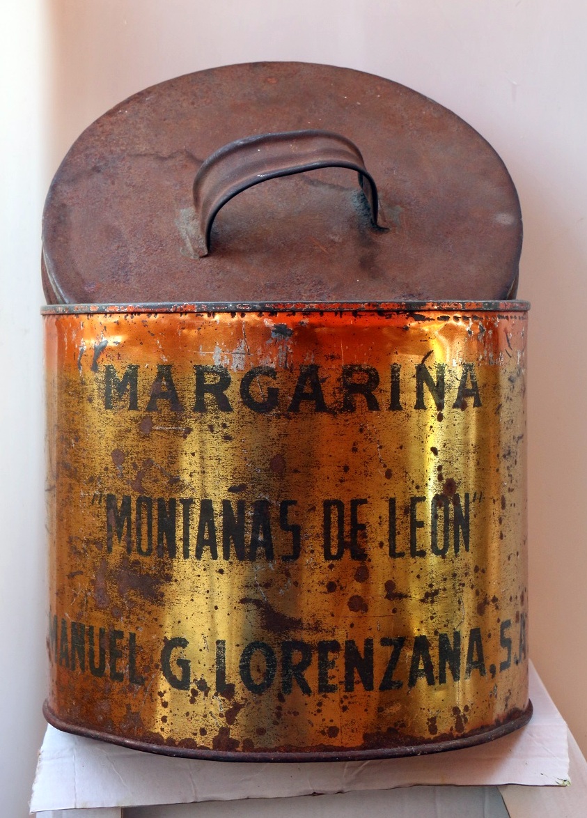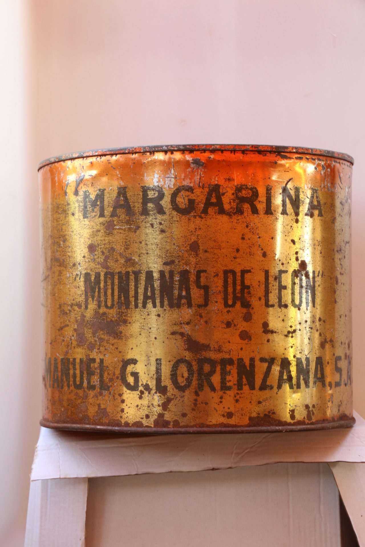 C010Bote metálico, MARGARINA MONTAÑAS DE LEON. MANUEL G LORENZANA S.A. 5 kg. Tapa artesana metálica con asa añadida.s/dLeón