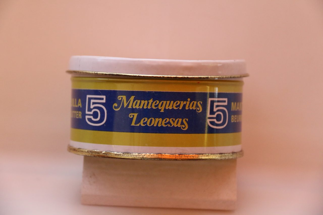 C009MANTEQUILLAS EXTRAFINAS DE VACAS DE LAS MONTAÑAS DE LEON. Garantizada Pura. Manuel G Lorenzana S.A. Mantequera Leonesa. Etiqueta Media Sal dorada en papel pegada en tapa. 300 grs.s/dLeón