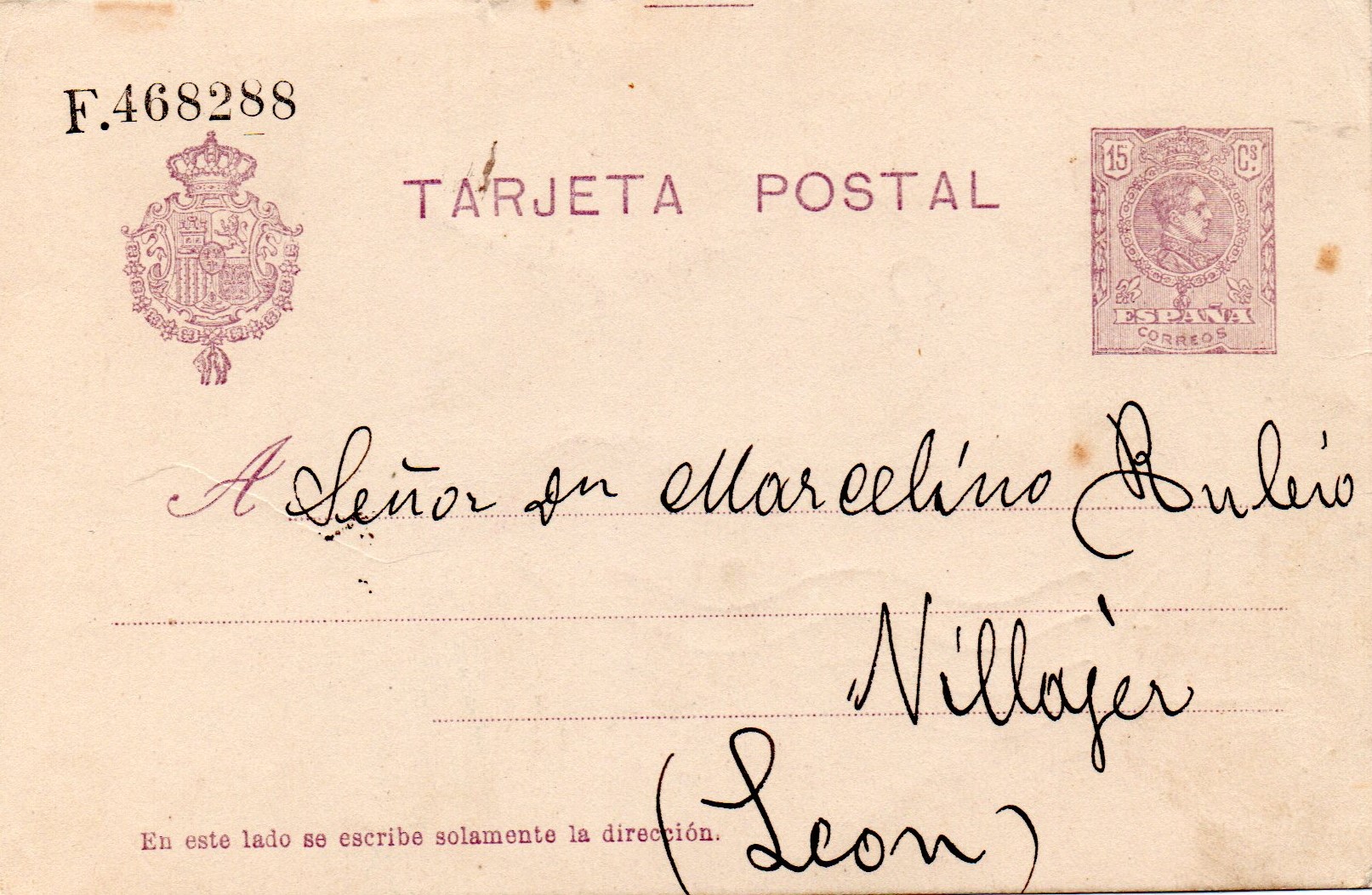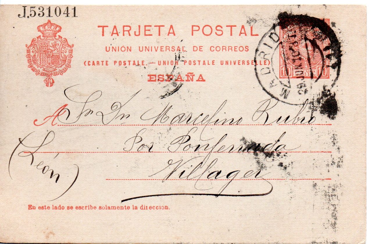 C026ENTERO POSTAL ENVIADO A MARCELINO RUBIO A VILLAGER. Remitido por Mantecas Finas Alvarez Cosmen, de Madrid, el 29 de junio de 1910.1910_06_29Villager ( León)