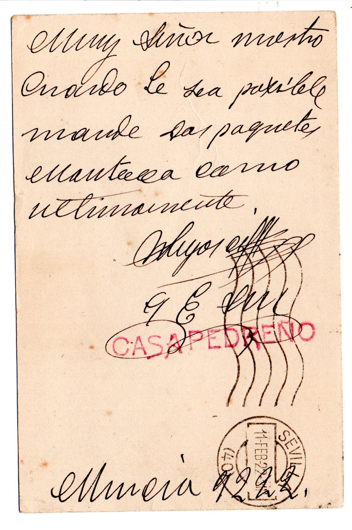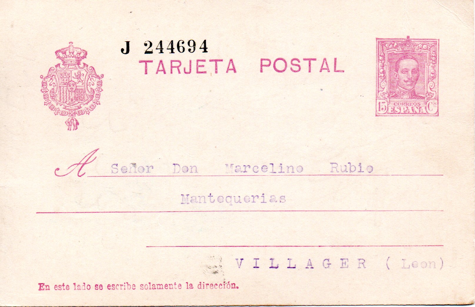 C027ENTERO POSTAL ENVIADO A MARCELINO RUBIO A VILLAGER. Remitido por Casa Pedreño, de Sevilla, el 11 de febrero de 1922.1922_02_11Villager ( León)