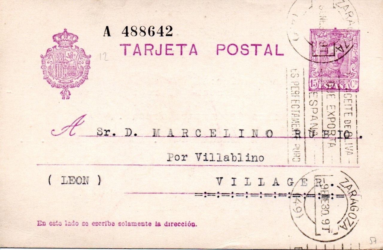 C028ENTERO POSTAL ENVIADO A MARCELINO RUBIO A VILLAGER. Remitido por V. Zorraquino, de MaZaragoza, el 9 de enero de 1930.1930_01_09Villager ( León)