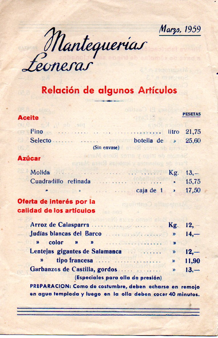 C030CATALOGO-LISTA DE PRECIOS. MANTEQUERIAS LEONESAS. Edición de Marzo de 1959. 8 pags., sin cubierta.1959_MarzoMadrid
