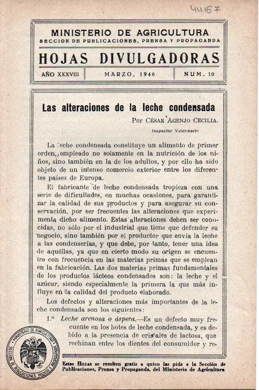 C039Separata, HOJAS DIVULGADORAS DEL MINISTERIO DE AGRICULTURA. Las alteraciones de la leche condensada. Por Cesar Agenjo cecilia. Marzo de 1946.1946_MarzoMadrid