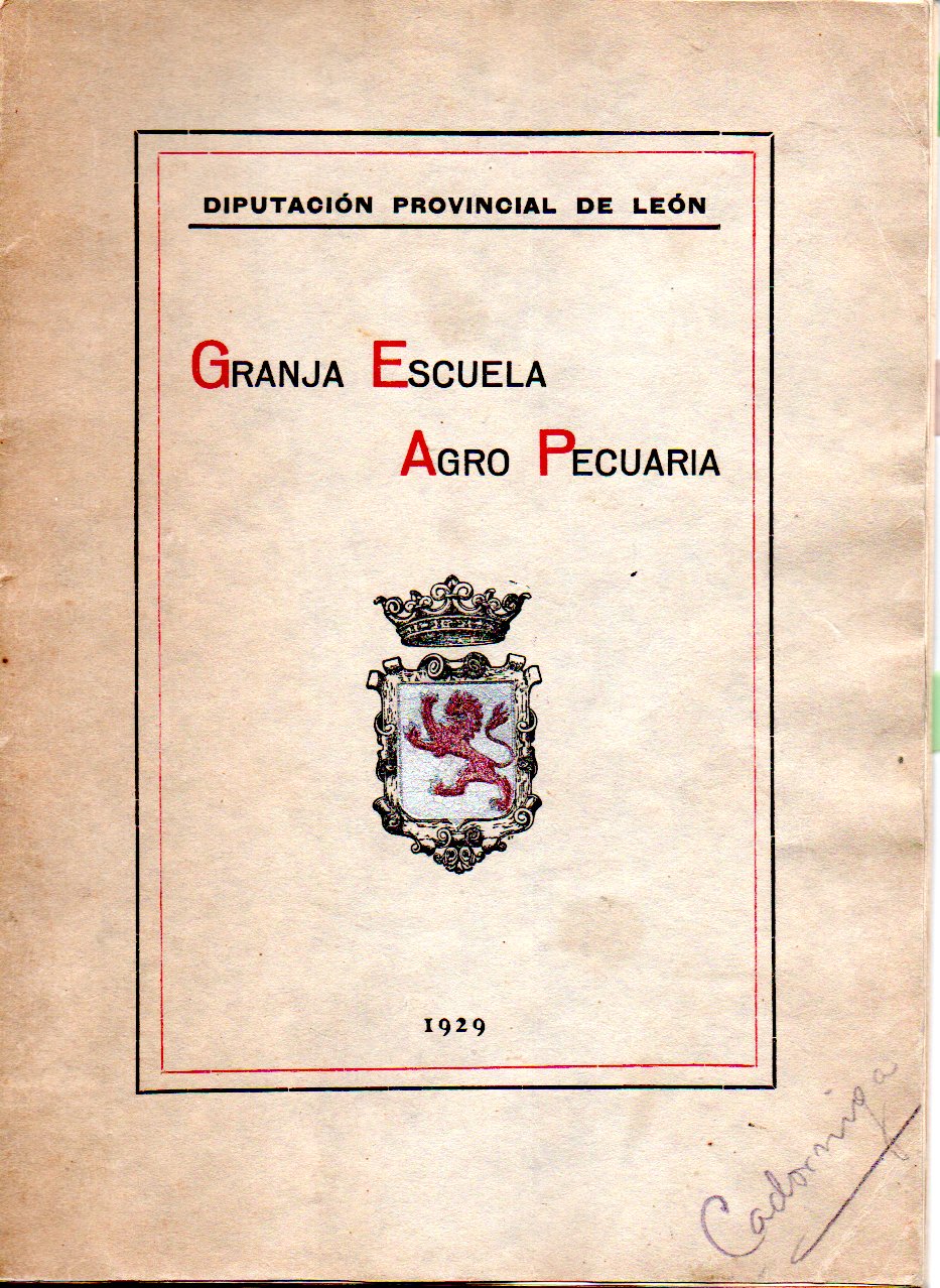 C045Publicación, GRANJA ESCUELA AGROPECUARIA LEÓN. Diputación de León. Imp. R. Luera Pinto. Con firma del ant. Prop. «Cadorniga».1929León