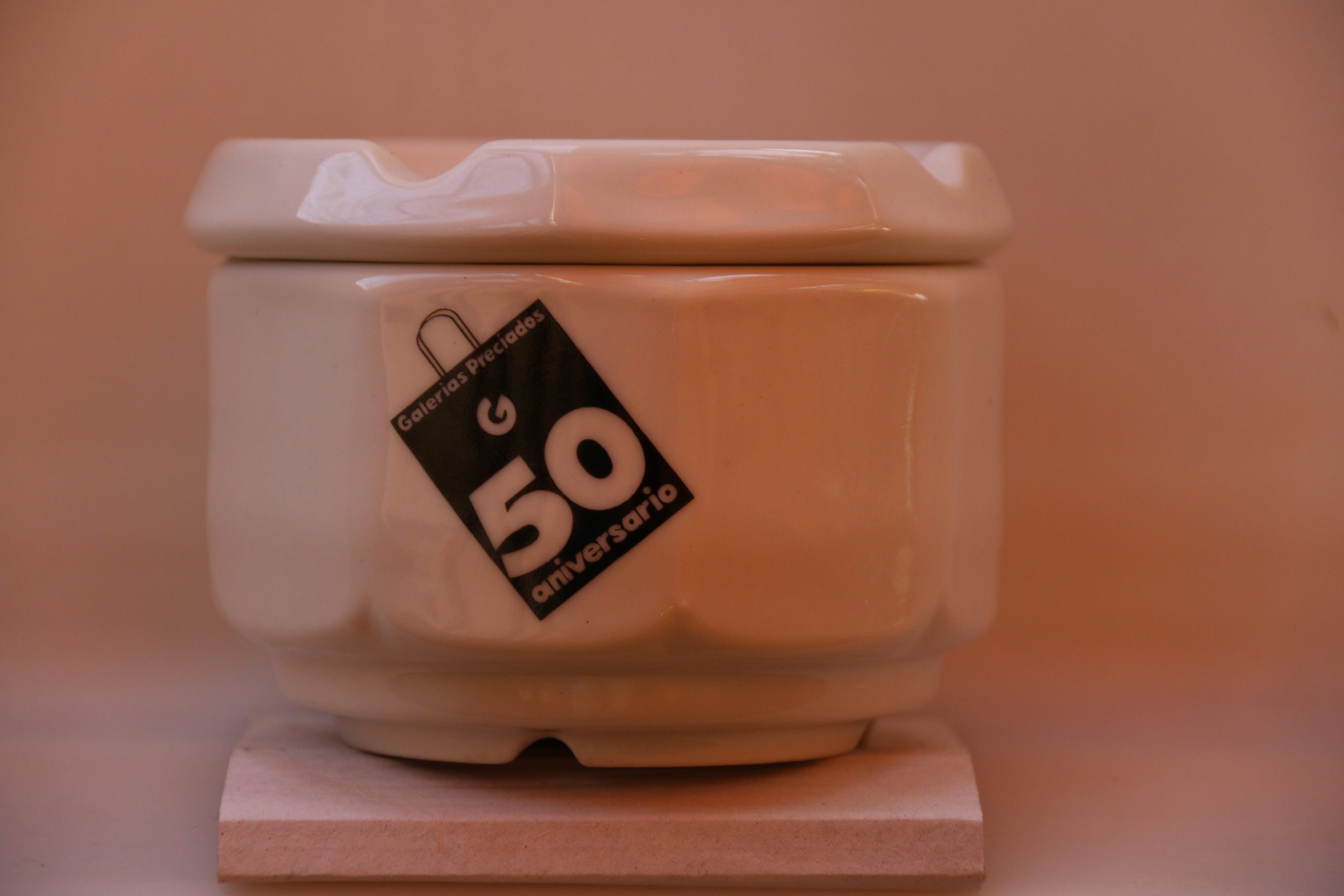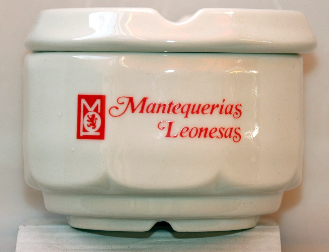 C047Cenicero, PUBLICIDAD DE MANTEQUERIAS LEONESAS Y GALERIAS PRECIADOS. Cenicero de agua en porcelana industrial con tapa. Caolín Spain.1993S/D
