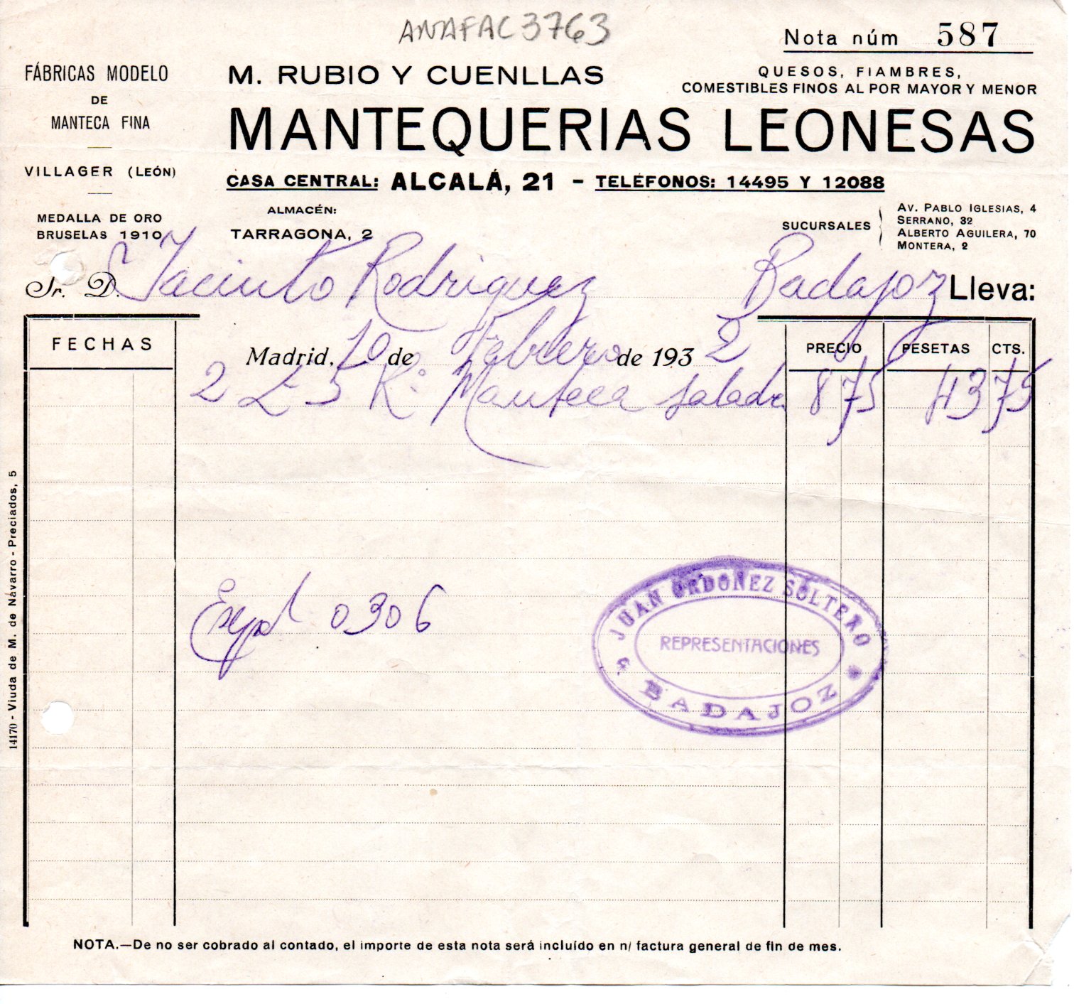C054Nota de venta,  MANTEQUERIAS LEONESAS. M. Rubio y Cuenllas – Fabricas Modelo de Manteca Fina – Villager (León). Almacen y 4 sucursales en Madrid. 10 de febrero de 1932, C/ Alcalá, 211932Madrid