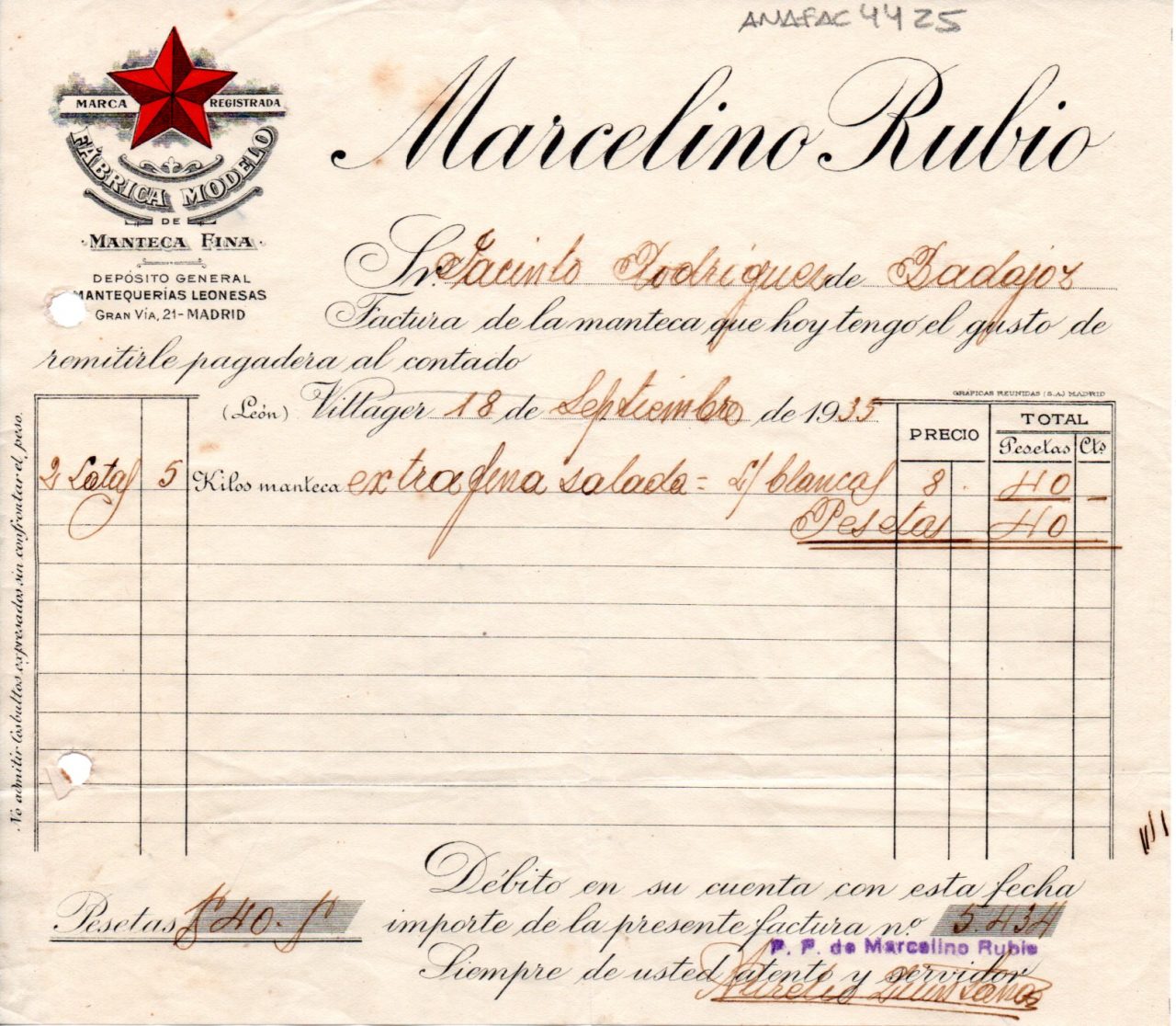 C055Factura de venta al contado MARCELINO RUBIO. Deposito General MANTEQUERIAS LEOENSAS. Fechada en Villager 18-09-35, C/ Gran vía, 21 – Villager (León)1935Madrid