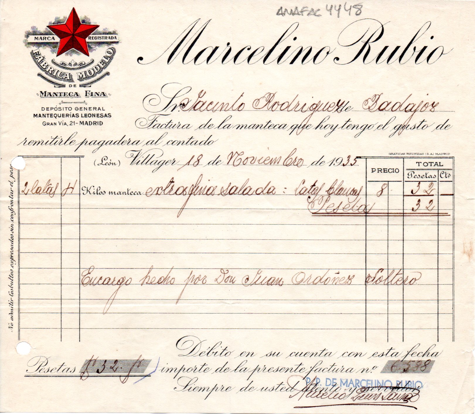 C056Factura de venta al contado MARCELINO RUBIO. Deposito General MANTEQUERIAS LEOENSAS. Fechada en Villager 18-11-35, C/ Gran vía, 21 – Villager (León)1935Madrid