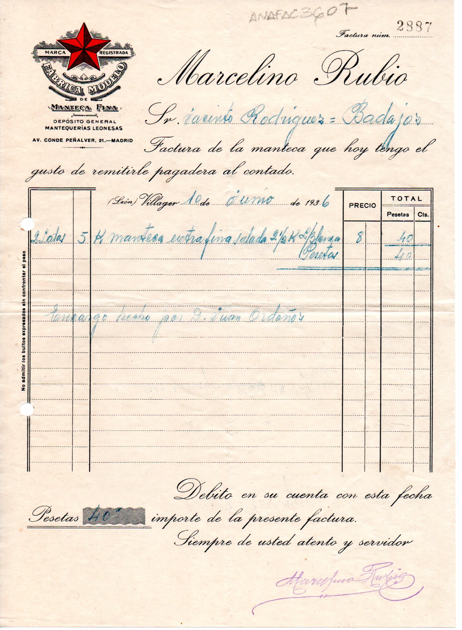 C057Factura de venta al contado MARCELINO RUBIO. Deposito General MANTEQUERIAS LEOENSAS. Fechada en Villager 10-06-36. Fda. Marcelino Rubio. Av. Conde Peñalver, 21 – Villager (León)1936Madrid
