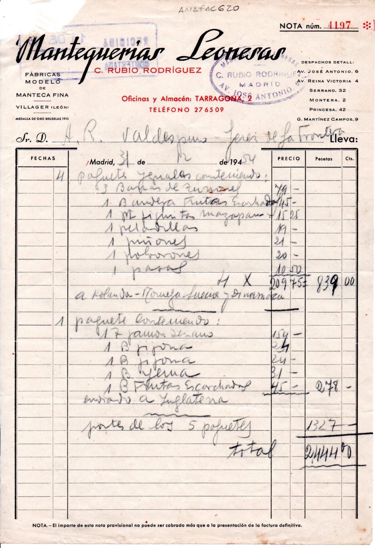 C058Nota de venta MANTEQUERIAS LEONESAS. C. Rubio Rodríguez. Fabricas en Villager ( León). Seis despachos en Madrid. 31-12-54,  C/ Tarragona, 21954Madrid