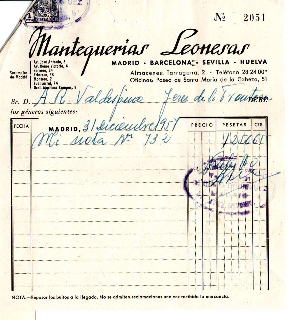 C059Nota de venta MANTEQUERIAS LEONESAS. C. Rubio Rodríguez.Oficinas: Avda. Jose Antonio, 6. Siete despachos en Madrid + almacen. También Barcelona – Sevilla – Huelva .31-12-57,  C/ Tarragona, 2  , Pso. Sta. Mª Cabeza, 51957Madrid