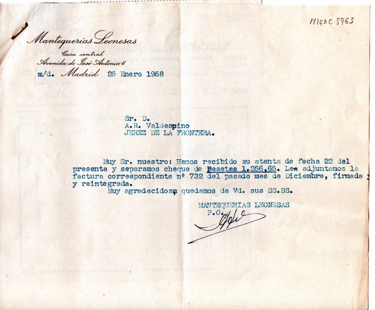 C060Carta comercial adjunta MANTEQUERIAS LEONESAS. Casa central: Avda. Jose Antonio 6. 21-01-58, Avd. José Antonio , 6, Madrid1958Madrid